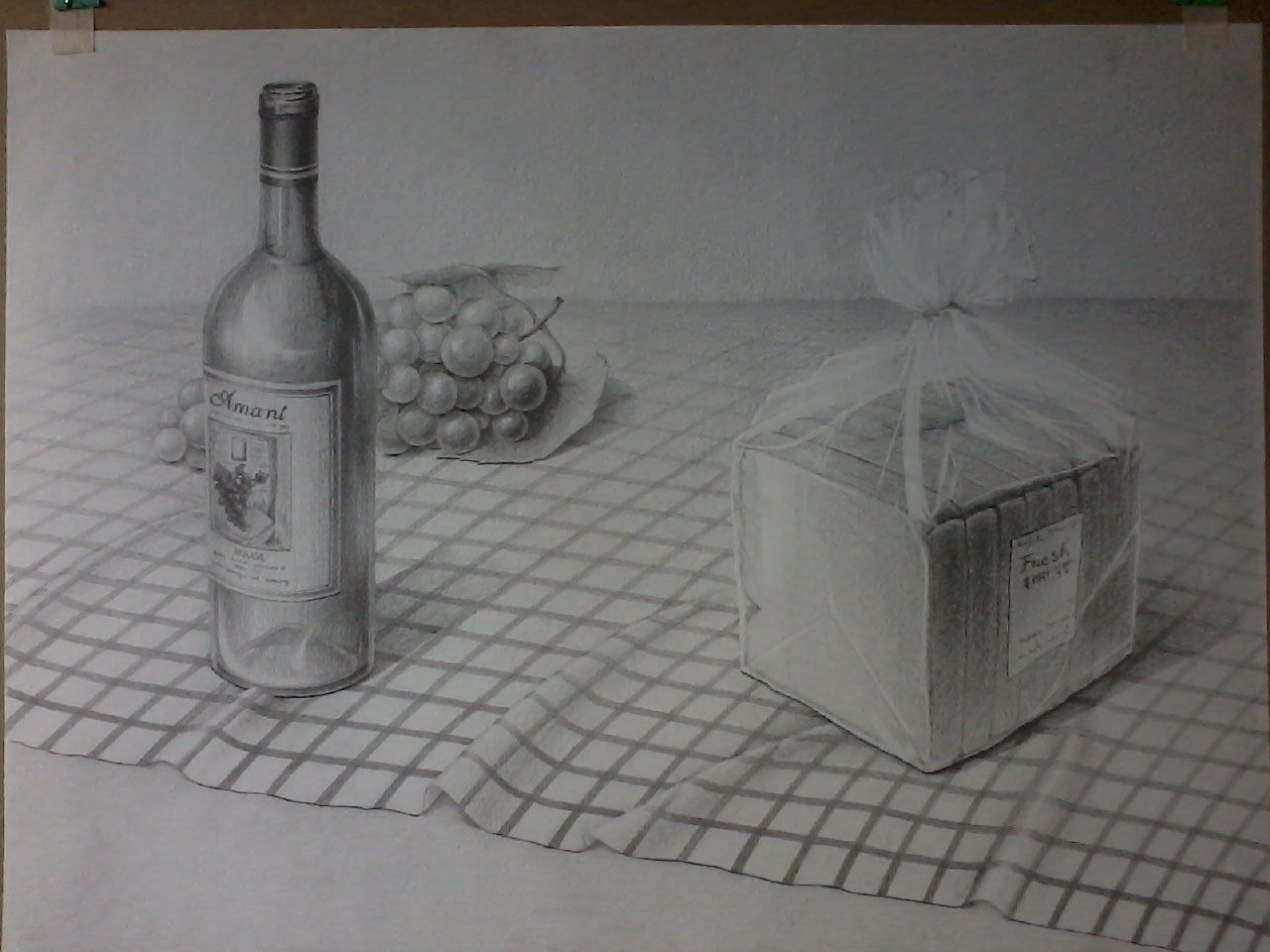 천 무늬모양이랑 명암이 제대로 됐는지 모르겠네요 바닥, 천(무늬빼고), 벽 모두 흰색인데 천보다 먼 벽쪽은 더 어둡게 칠해야 하나요,, 글고 식빵 포도도 맞게 그린건지 봐주세요~