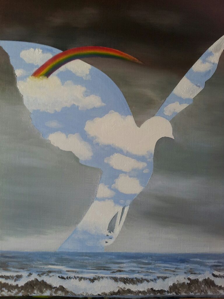 작품의 주제는 정확히 이해하지 못하지만 어렴풋이 마음에 와 닿는 느낌이 좋았습니다. 선생님이 그려 넣으신 무지개도..