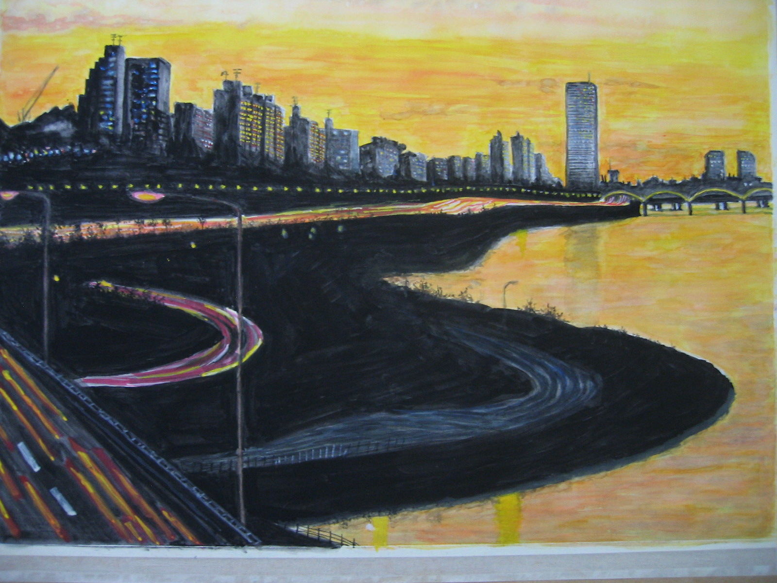 안녕하셨읍니까 .?야경올려봅니다.무채색 물감 안사고 손녀 학교 서 쓰는 포스터칼라 로 그렸씀니다 60년대. 학교 미술실 에서 반공 포스터 그리던 생각 이 나내요 . .마스킹 태프사용안하고했읍니다.아주 오래전에 태프와 마스킹액을 3번 사용해본 기억이있는대 도화지가 들고일어나 힘든기억이...그냥칠했읍니다, 지송^^조언부탁드림니다 ..