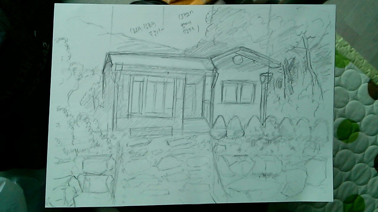 안녕하십니까. 실력이 부족한 만큼 자주 질문을 올리려고 노력은 하고있으나.. 그렇게 하지 못하는 주거야화입니다 ^^;;;; 이건 저번주 토요일날,[양쌤의 실전만화공방] 중급강의 6주차 1강을 들으면서 대충대충 따라그린 것입니다 물론, 제 성격성 본격 연습을 하리라 생각되지만, 약간 대충 그린것이야말로 자신의 약점이 잘 드러날 것이라 생각하여 연습하기전에 이 그림으로 올립니다. -제가 정말로 기다렸던! 배경강의인 만큼 일단, 약점이 잘 드러날 만한 그림으로 질문을 하고, 그 다음에 [인물이 연기하는 것]과 그 상황에 적절하게 묘사된 [배경]이 들어간 그림을 더 올리 고자 합니다. P.S. 아... 분명히 SD에 관해서 질문하고자 했었습니다만..... 왠지 연습할 꺼리가 많아서 제가 '이렇게 변형시킨것이~ 과연 연기하는 인물의 특성에 맞게끔 변형시킨것인가'에 관해서 질문을 올리려 한다면.. 왠지 작품별 강의에서 이야기하신 '캐릭터디자인'정도의 정성을 쏟아야 될 것이라 여기기 때문에, 조금더 가다듬고 질문 올리고자 합니다. 날짜가 더 지나가기전에 가능한 한 SD에 관해서 질문하고싶습니다. --------------------------------------- 일단, 강의에서 직접 양쌤이 '본인의 집' 사진을 보고 그리신 그림이기 때문에, 어떠한 내용인지는 잘 아시리라 생각됩니다. 보다시피...... 산속에 있을 듯한 풍경 좋은 집입니다^^;;; 제가 배경강의를 기다렸던 이유는... 예 말그대로, 전 '배경묘사'가 약합니다 ㄷ_ㄷ;; (그렇다고해서 전 기피하는 편이라기보단.... 오히려 배경을 잘 묘사하고 싶어서 안달이 난 타입인데요 ㅋ_ㅋ;;;;;;) 비록, 정말 대충그린 배경이긴 하지만, 제 약점과 함께 이야기하겠습니다. 제가 생각하는 제 약점을 들자면 .....제가 '양쌤만화 초급과 중급강의를 듣기 전'에 배경을 그릴때는 이렇게만 연습했습니다. ● 사진을 보고, 지평선 부근이 어디인지 먼저 잡습니다. ● 각각의 요소들의 윤곽선을 그리는 대신 선으로 원근 스케치 하는것으로 드로잉을 시작합니다. 제가 여태까지 올린 그림은, 대게 소실점을 안잡고 그리는 경우가 많았습니다 ^^;;; 인물만 그려서 올렸기 때문에...도 있지만 배경그릴때와 인물 그릴때 따로 놀았었죠 !!;;;; 아직도 그럴것이라 생각합니다. ;;) -> 강의에서 양쌤이 연필 쓰시는 것과 같이 능숙하게 분위기를 잡지는 못합니다.(연습필요) 대충 말하자면, '묘사'에 치중됬다고 해야할까... 그리고 위의 두 요소는 확실히 작화스피드를 떨어뜨릴것이라고 여깁니다. (정성안들인 그림가지고 이런거 따지기는 뭐하지만 ㅎㅎㅎㅎ;;;;) ● 사물을 아직 동일화, 평준화, 규격화 할만큼의 역량을 키우지 못했습니다.(연습필요) -> 이것은 즉, 배경그릴때 강의 듣기 전에는 걍... 쌩으로 보고 따라 그렸습니다 ㅎㅎㅎㅎ;;;; 소품을 거의 그렇게 그렸으니 무쟈게 시간 많이 걸리겠지요 ㅎㅎ?;;;;; 강의 시간에 말씀하셨듯이, 양쌤이 '어시생활'하시면서 직접 해보셨기때문에 무슨 느낌인지 아실 것이라 여깁니다 ㅠㅠ;;; 매번 직접 보고 그리다간 한 컷 그리고 날 샐 것 아닙니까 ㄷㄷ;;;;;;;;; ● 최근에 연습을 많이 해서인지 이젠 지우개로 수정하는 일이 상당히 줄어들었습니다. 하지만. .. 연필쓰는것에 미숙합니다. (특히나 필압조절이 생각만치 잘 안되는군요..... 제가 헬스운동을 즐겨하는 타입이라 그런건 아니겠지요...? 양쌤께서는 야구 하셔도 지장없으시니까...) 으흠. 이건, 양쌤께서 데생하실때 습관처럼 손이 움직이신다고 하셨는데 제가 양쌤 강의를 보면서 양쎔 손의 움직임을 보면... 마치 어떨때는 펜 터치를 연필로 하는듯한 느낌이 들기도하고, 어떨때는 손에 바이브레이터(전동기)가 달린듯이 움직이신달까 ㅎㅎ;;; 실제로 그런 느낌으로 하시는지 아닌지 저는 잘 모르겠습니다만... 양쌤께서는 데셍선을 얇게 잘 뽑으시는 것 같은데... 숙련도와 관계가 있습니까? (지금 제가 올린 거친 선을 보셔서는 모르겠지만 ㅇㅎㅎㅎ;;;; 확실히 연습하면서 선이 점차점차 덜 거칠어짐을 느낄 수 있습니다.) ㅡㅡㅡㅡㅡㅡㅡㅡㅡㅡㅡㅡㅡㅡㅡㅡㅡㅡㅡㅡㅡㅡㅡㅡㅡㅡㅡㅡㅡㅡㅡㅡㅡㅡㅡㅡㅡㅡㅡㅡㅡㅡㅡ 대부분, 이러한 것들을 개선하려면, 당연 연습이 제일 필요하다는 것을 인지하고는 있지만... 그래도, 일단의 조언을 듣고 연습에 들어가면 제 만화 배경 연습에 도움되지 않을까 해서 이렇게 약점투성이인 그림으로 질문을 올립니다 왠지 핵심을 이야기 못한것 같습니다!!! 제가 생각하는 약점만 이야기하고선 ;;; 지금 치는 요 부분만 읽고 질문에 답변을 달아주셔도 좋을것 같습니다. 요기서의 질문 주제는 '흔히 풍경화를 그릴때 사용하는 (지평선)과 (소실점)을 잡고 그릴 때 하고 잡고 그리지 않을때하고, 비슷하게 그려내는 것에 대해서, (만화적인 표현으로) 주변사물과 배경의 형태를'만화'에서 그리는 것 처럼 어색하게 하지 않게하는 데 양쌤이 생각하시는 좋은 방법이 있습니까? 있다면, 어떤방향으로 연습을 하는 것이 효과적입니까?' 입니다. 편하게 가려는, 즉 '편식'하고자 하는 태도는 아니지만, 기왕 알아두었으면 좋을것 같아서 요런 질문을 올립니다. 배경강의를 집중적으로 더 보고, 책도 참고