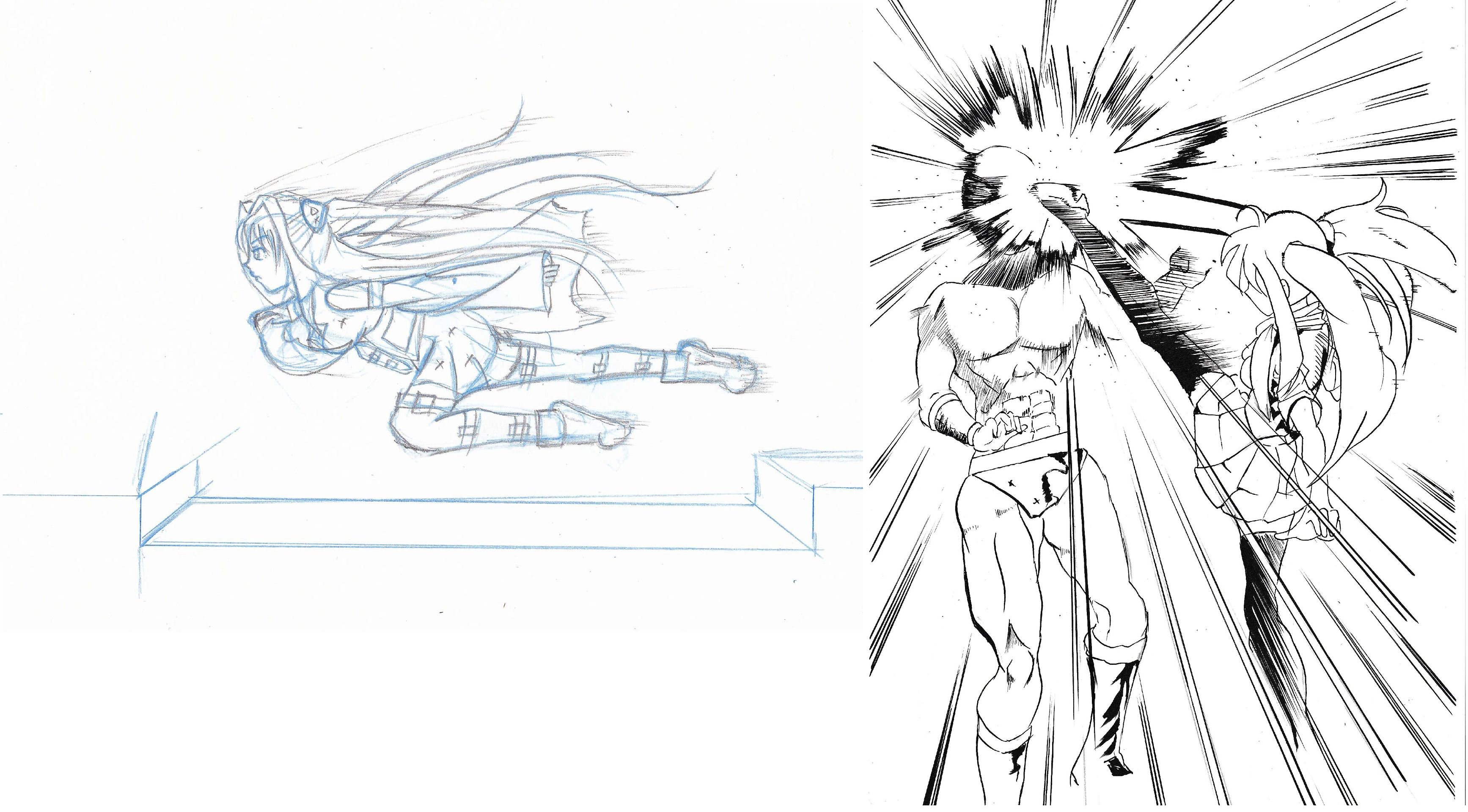안녕하십니까. 여전히 자선 연구중인 (=_=ㅋ;;) 주거야화입니다. 으흠.. 양쌤의 강의에서 보면, 독자를 향해서 돌진하던지, 독자를 노려보던지 와 같은 출판만화에서 볼수있는 모범적이고 좋은 앵글(?)의 예를 많이 소개해주셨습니다. 참 도움이 많이 됬습니다. 그렇지만..... 제가 응용력이 좀 뒤떨어지는 편이라.... [독자가 캐릭터 옆을 보고 있는 앵글에선 어떤 자선을 넣지 =_=;;?]와 같은 문제에 봉착했습니다. 제가 질문하고싶은 그림은 (왼쪽) 그림이고, (오른쪽)그림은 양쌤의 강의를 보고 나서 따라그린 제 스스로 '참고해보기위한'그림입니다. 왼쪽그림은 모 만화의 캐릭터를 몇번 그려보고, 익숙해진 상태에서 직접 연기를 시도한 그림입니다. 상황은...(낮은 주택 지붕 위에서 돌진하는)상황입니다. 그 상황을 옆모습에서 그려봤습니다. 물론 제가 스스로 적절하다 생각되는 자선을 넣어볼수는 있으나 그래도 조언을 한번 들어보고 연습해볼까 생각하여 올립니다. 질문의 포인트는... ㅡㅡㅡㅡㅡㅡㅡㅡㅡㅡㅡㅡㅡㅡㅡㅡㅡㅡㅡㅡㅡㅡㅡㅡㅡㅡㅡㅡㅡㅡㅡㅡㅡㅡㅡ 1.마찬가지로 인물의 진행방향과 똑같은 방향으로 자선을 넣어야할까요? (그게 옳은 표현일까요 ^^?;;;) 그렇다면, 배경처리는 어떻게 해야합니까? 자선과 배경을 겹치는 것과 자선을 넣고 자선을 넣지 않은 부분을 제외한곳을 화이트로 냅두는것과 두 표현은 (왼쪽)그림에서 어떤 차이점을 보인다고 생각하십니까? 2. 진행방향과 똑같은 방향으로 자선을 구지 넣지 않아도 된다면, 어떤 표현방법이 있습니까? 저의 경우엔 (오른쪽) 그림과 같은 형태는 아닐지라도, [집중선을 넣어보는것은 어떤가?]도 생각해보았습니다만.... (판단이 안서니까 여쭤보는것이겠죠.....?;; ㅠ) ㅡㅡㅡㅡㅡㅡㅡㅡㅡㅡㅡㅡㅡㅡㅡㅡㅡㅡㅡㅡㅡㅡㅡㅡㅡㅡㅡㅡㅡㅡㅡㅡㅡㅡ 만화책에서 캐릭터 옆모습을 다루는 앵글(특히 제가 그리는 왼쪽그림과같이 전신을 다 그린)은 좀 찾기가 어려웠습니다.(애니메이션에서는 종종 보이긴 하지만......) 그래도 그릴줄은 알아야할것 같아서 여쭤봤습니다^_^;;;; "진행방향으로 넣는 자선"과 "집중선" 이외에도 옆모습에서 넣어볼만한 자선은 존재합니까? 그렇게까지 다양한 자선을 접해볼 기회가 없어서 잘 모르겠습니다. 답변 부탁드립니다~(꾸벅)