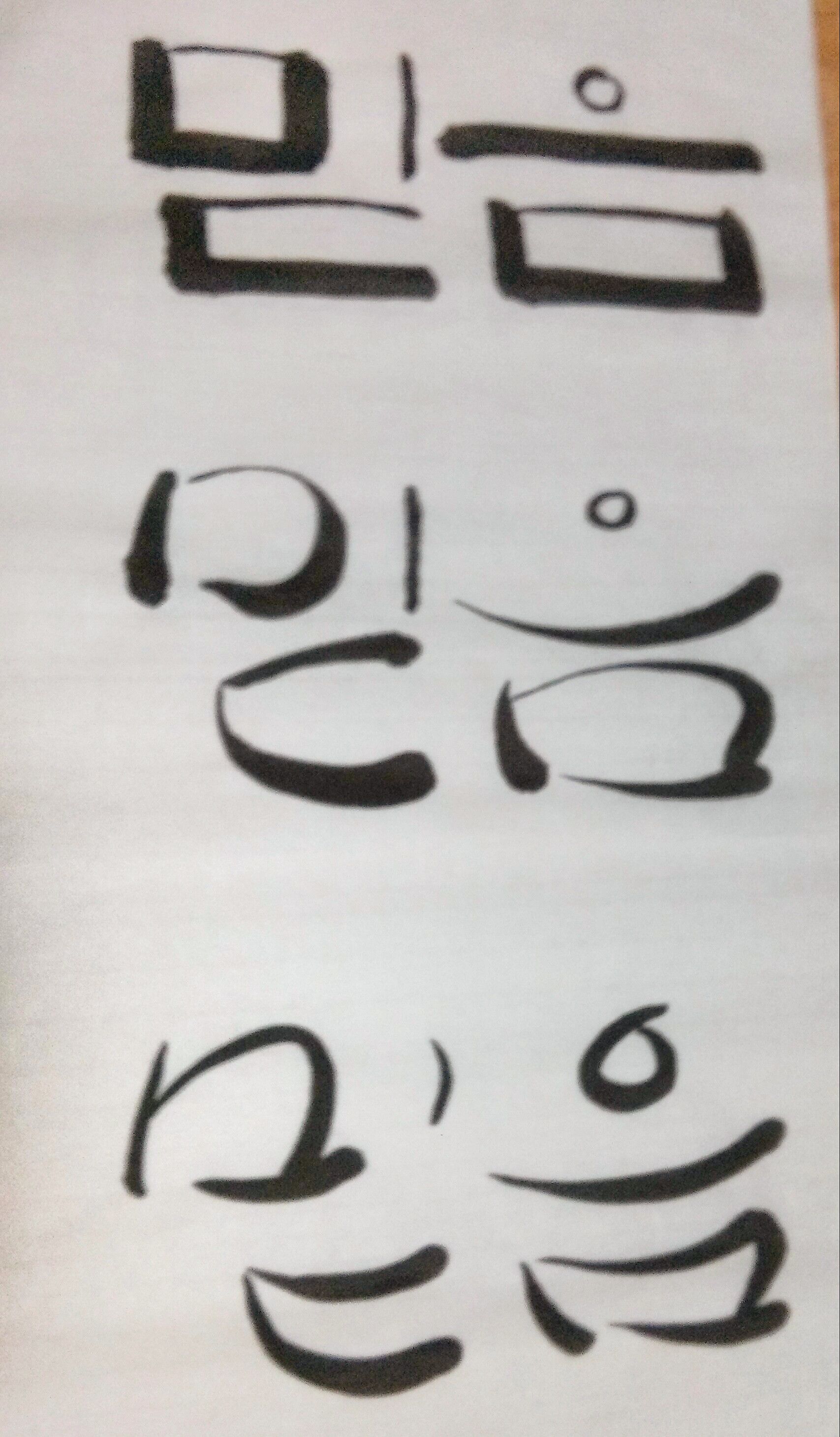 오늘선생님의강의를 듣고 깨우침을많이 얻었습니다 전 항상 틀을깨려고만했습니다 그냥 남들다쓰는 흔한글씨가아닌 나만이쓸수있는그런거생각하느라 많은시간을생각하고 공들였는데 물론당연히이런노력들이필요하지만 한사람의클라이언트의 주문이아닌 대중적인 글씨. 많은사람들이공감할수있는글씨를 더 추구해야겠단생각이드네요 ㅋㅋ 훨씬 시간이덜들더라구요 나름 믿음은 글씨자체에 믿음감을실고자 판본체를응용 받침쪽에 무게를실어 안정적으로보이게했습니다