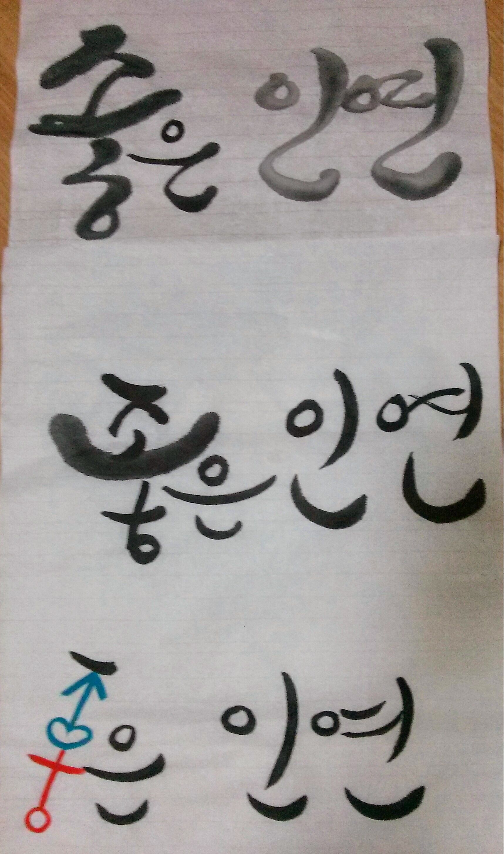 선생님 갈수록너무어렵네요 어떤글씨체로써야할지 그리고 힘조절도안되고 얇게쓰려고 힘빼면손이달달떨리고 획도끊어지기쉽상이고 힘을주어 굵게쓸라치면 멋도없게되고 굵게뚝뚝끊어지고 머릿속에생각한글씨대로 화선지에잘쓰기가쉽지않아요 그리고 이런문장중에 써보라고추천해주실만한문장좀요 그거 고르기가만만치않네요 담엔어떤문장들을좀연습해볼까요 동영상강좌는낼부터 영문이에요 한글도이렇게못쓰고있는데ㅠㅠㅠㅠ