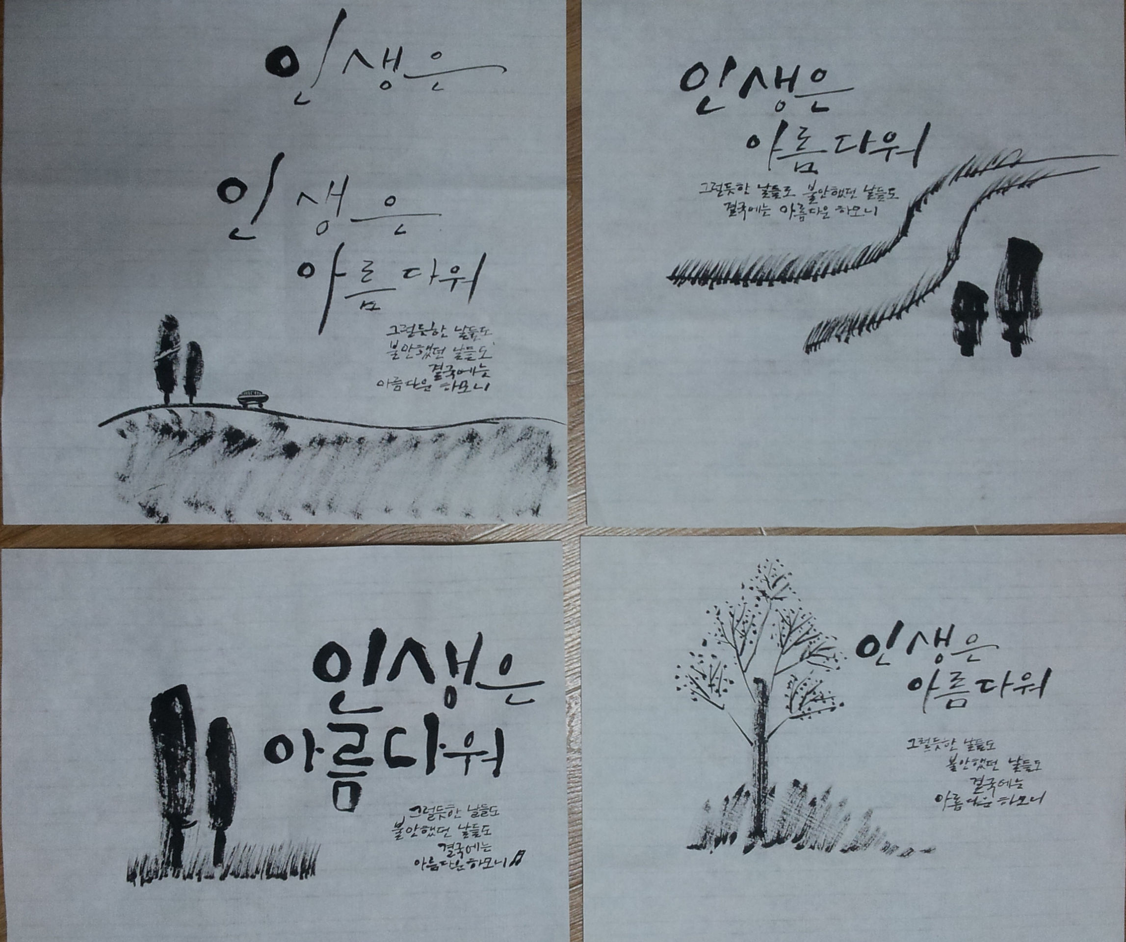 문구: 인생은 아름다워 그럴듯한 날들도 불안했던 날들도 결국에는 아름다운 하모니밑에 글귀에 그림을 조금 넣어서 표현하려고 합니다.글씨에 모양을 조금씩 변화를 주어서 써보려고는 노력했는데...역시 표현하는데 아직은 한계가 심히 많습니다.보완 수정해야 할 부분 부탁드립니다~~