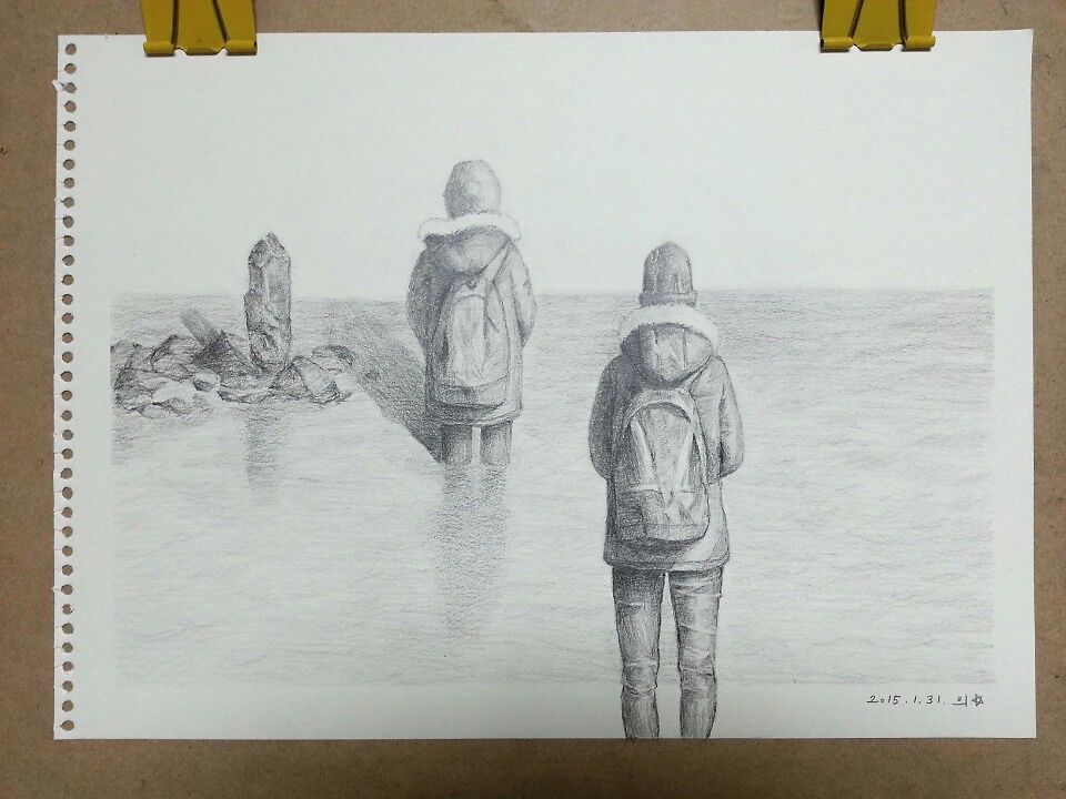 작품을 마무리 하는데 시간이 많이 걸려도..선생님 말씀하시는것 천천히들으면서하면 차분하게 되는 것 같아요..^^ 바위랑 청바지 부분은 묘사를 잘 못하겠어서 선생님께서 하시는것만 보고 적당히 따라했습니다 ..^^;ㅎ아직 사진만 보고는 어떻게 그려야할지 생각이잘 떠오르지 않는것 같습니다 ..