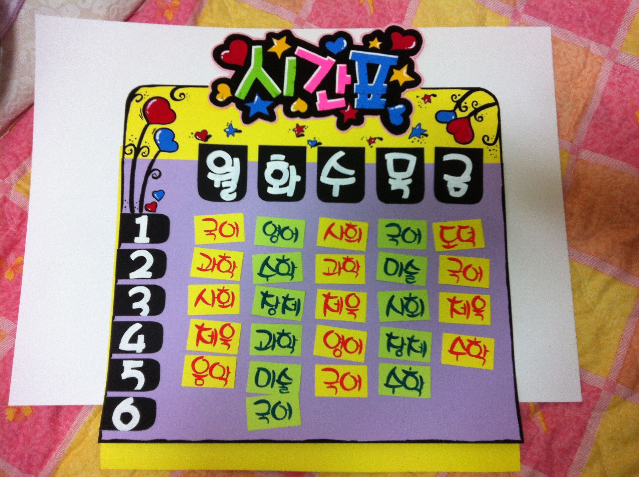 한국에 돌아와서  큰애가 아직 학교 배정이 안되었어요.. 배정 되고 나면 시간표 과목에 우드락 붙여서 다시 올릴게요,.. 보충해야할 부분은 어딘가요?쌤!!!