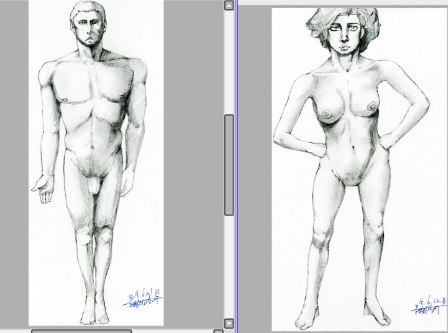 저번에는 목이 너무 짧아져서 이번에는 목을 조금 늘려서 그려보았습니다. 저번보다 나아졌길 조심스레빌어봅니다.남녀 포즈는 저번에 사 두었던 인체 드로잉 참고서를 보면서 따라 그렸습니다. 저번에 짚어주신 부분들을 고쳐보려고 했는데 고쳐졌는지 잘 모르겠네요.두 장을 따로따로 올릴까 하다가 사이툴로 하나로 묶어 편집한 후, 같이 올려봅니다.좋은 하루 보내세요.