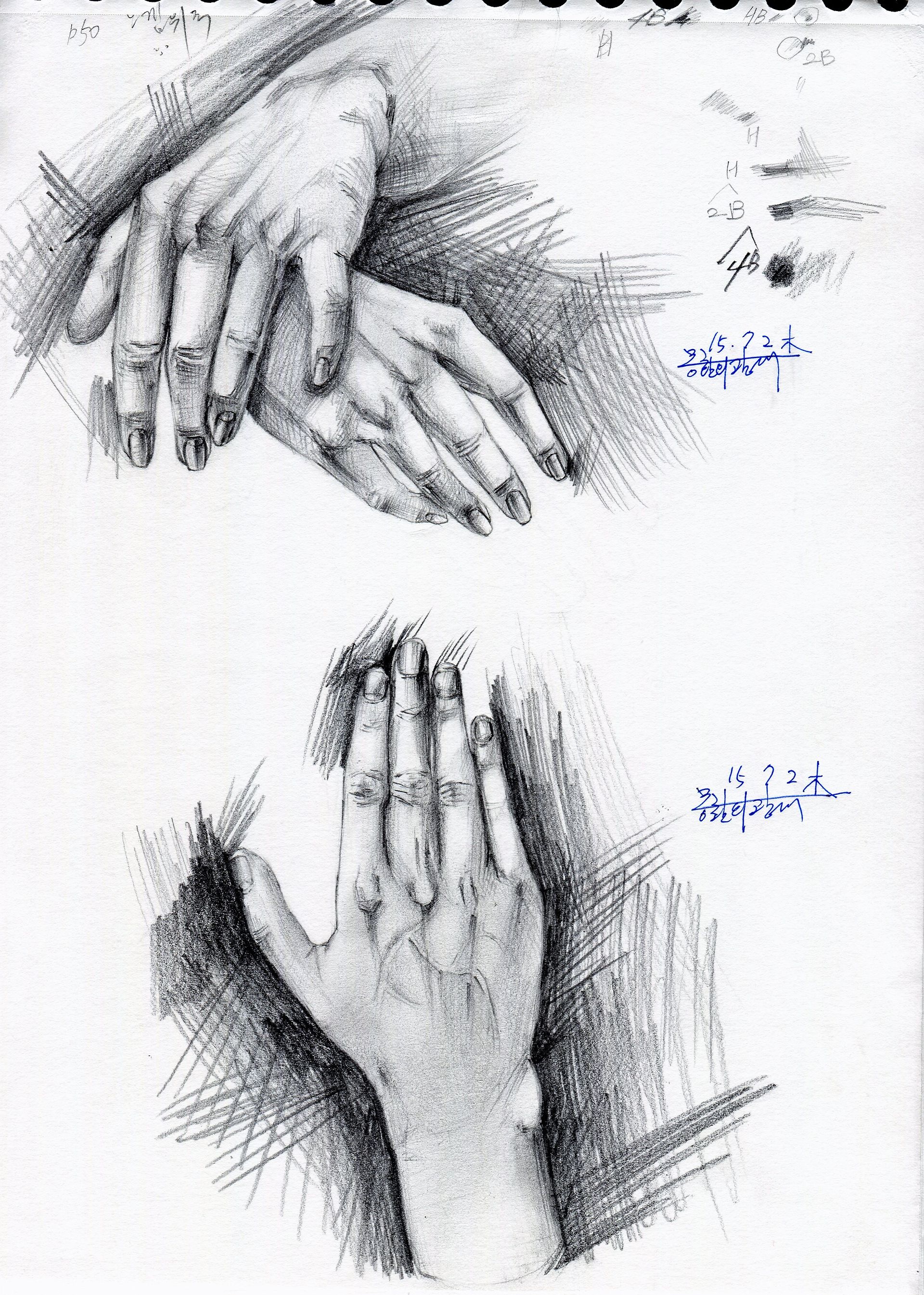 선생님 강의 듣고 손을 그리니까 엄청 쉽게 쉽게 그렸습니다. 그 동안 제 고질병이 손을 안 그리면서 최대한 숨기는 거였거든요. 그리더라도 강의에서 말씀하신 것처럼 벙어리 장갑 낀 것처럼 뭉툭하게 그려 왔습니다. 어려워서 피하기만 했었습니다. 특히 팔에서 손목이 시작되는 부분, 중지의 길이, 새끼 손가락이랑 손날이 시작되는 부분이 이상하게 그리고 나면 이상해져서요. 자신이 없다 보니까 자꾸만 손을 숨긴 포즈의 그림만 그리고 있었습니다. (상체만 그린다든지 하는...)