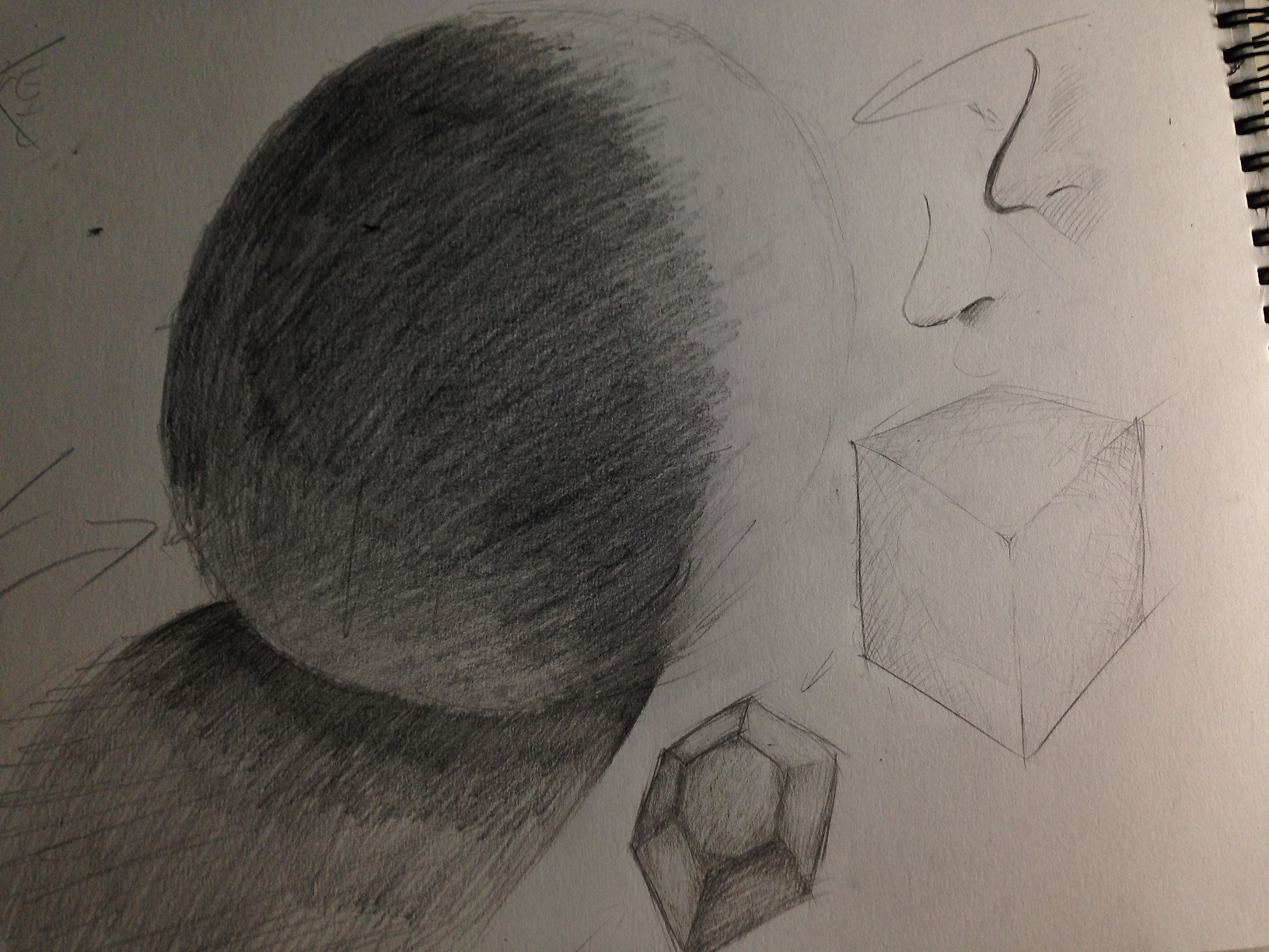 빛 강의듣고 그려봤습니다. 이번 강의는 좀 어렵네요;열심히 그렸는데 결과는 좀 별로인것같네요. 특히 구가 왠진 모르겠지만 이상해보여요. 중간톤을 조금만 쓰라고 하셔서 명암을 진하게 넣는데 너무 시커먼것같네요. 그리고 옆에 다른것들도 평가 부탁드립니다.