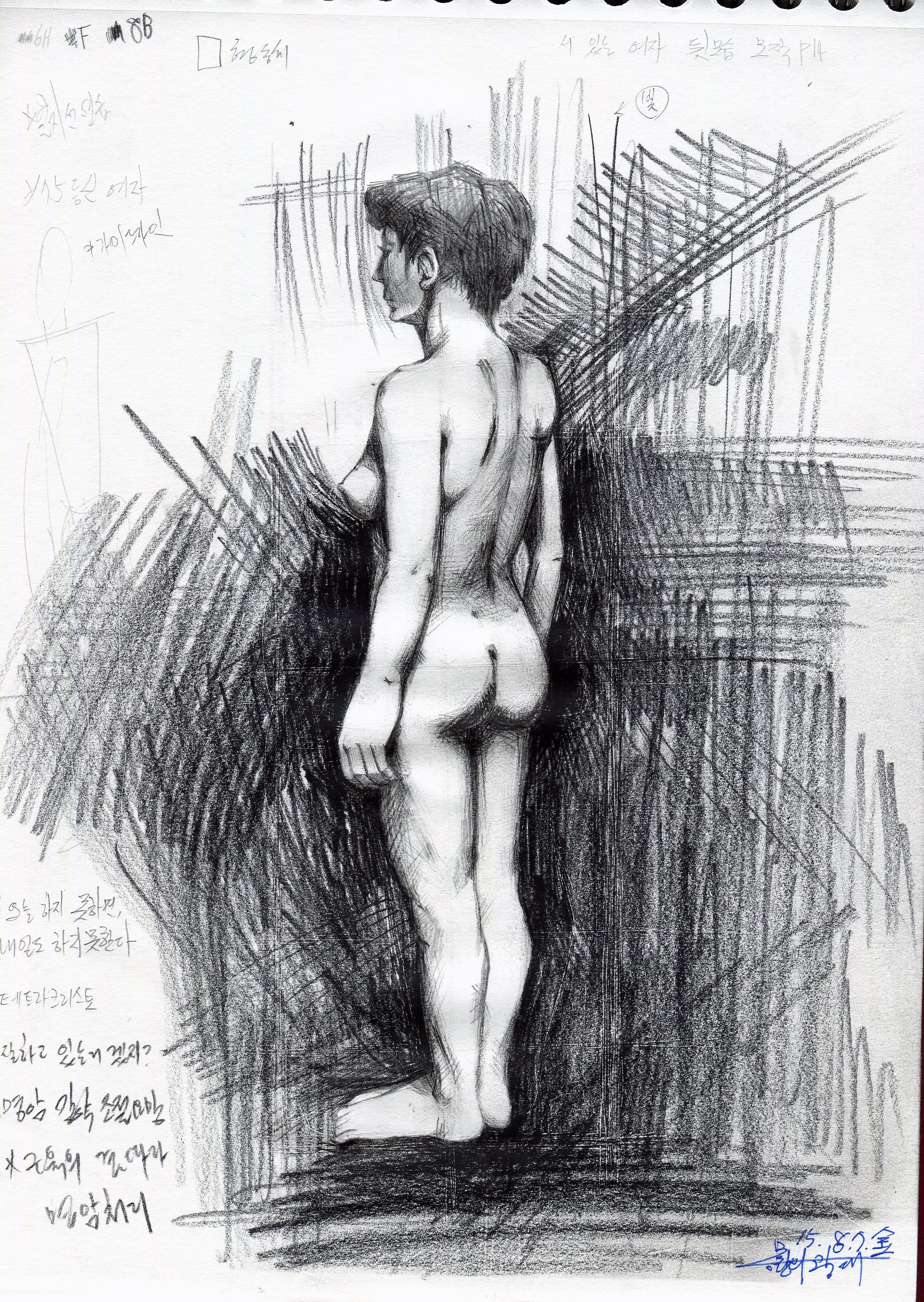 이번에는 같은 누드집에 수록된 여자 포즈를 보고 모작해 보았습니다. 저번 여자 그림보다 어려웠던 게 척추 라인 그리는 거였습니다. 무조건 일자로 쭉 뻗은 라인이 아닌지라 위치 설정을 잘 못하겠더라구요. 결국 중심선에 의존해서 중심에서 거리가 얼마나 멀고 가까운지를 잡아서 그려보았습니다.