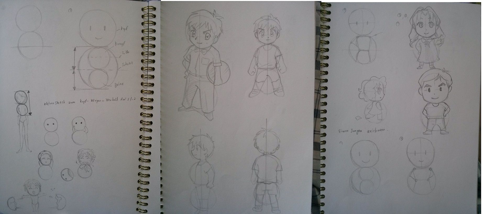 3번째 그림은 2등신으로 그리는 방법입니다. (3개다 드로잉서적보고 연습한거 중 일부인데요.)