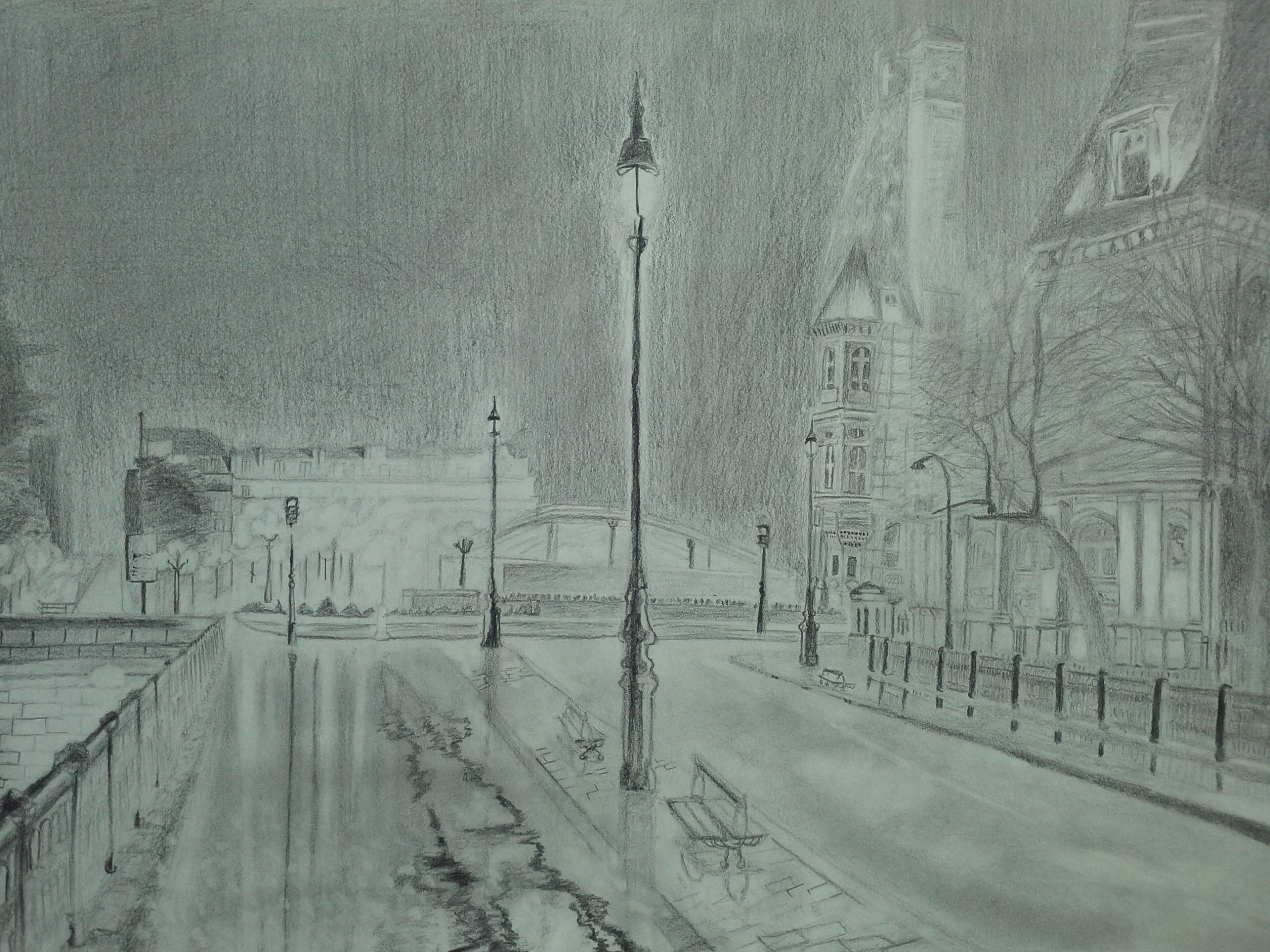 형태적으로 정밀하지 못한 건 저의 근성 탓으로 치더라도 저 나무는 좀 그렇군요. 저건 빛을 받지 못해 검은 가지들이 수없이 얽혀있는 상황인데 단순히 선을 강하게 해도 되는지 의문입니다.