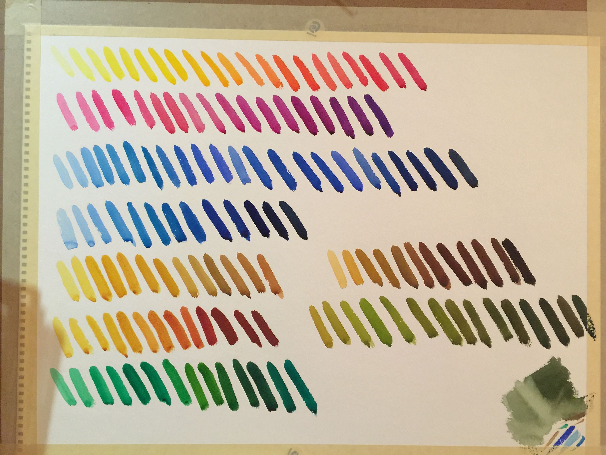 명도는 그나마 할만했는데 이건 훨씬 더 어려웠어요. 물감 짜는 순서도 달라가지고는 몇번이나 망쳤네요 ㅎㅎ 근데 전 옐로우 그린? 그리니쉬 옐로우? 그거랑 올리브 그린 이런 노랑섞인 녹색 물감들이 없어서 오른쪽 아래에 따로 그냥 갈색이랑 샙그린이랑 후커스그린들을 섞어서 대충 만들어봤어요. 글구 위에서 두번째는 핑크-보라색 물감들이 몇개 있길래 그것들로도 단계를 한번 해봤어요.