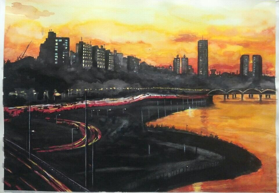 도심의 노을 풍경을 그렸어요.
