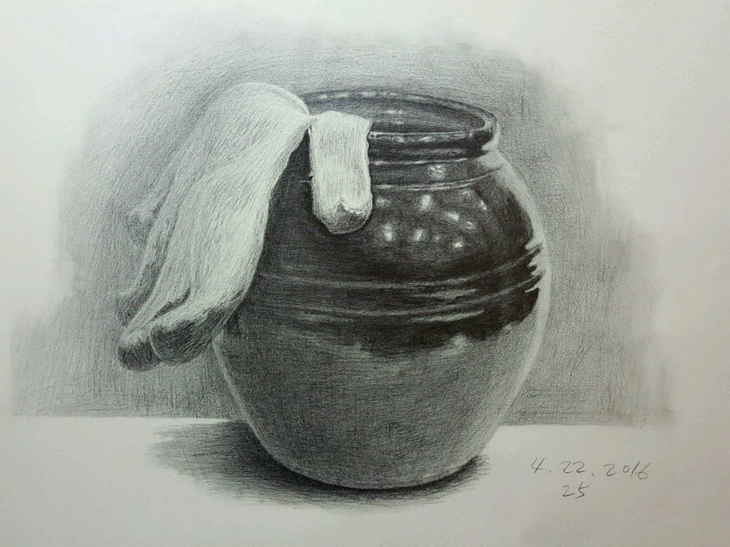 빛은 오른쪽에서 온다고 생각하고 그렸어요.그래서 기본적으로 항아리의 하이라이트는 오른쪽 위에, 항아리의 그림자는 왼쪽하단에 표현 햇어요,항아리의 주제부분이 강하게 나타나고 다른부분은 덜 강조되니 빛의 의한 어둠의 영역을 구분하는게 어렵게 느껴집니다.감사합니다.