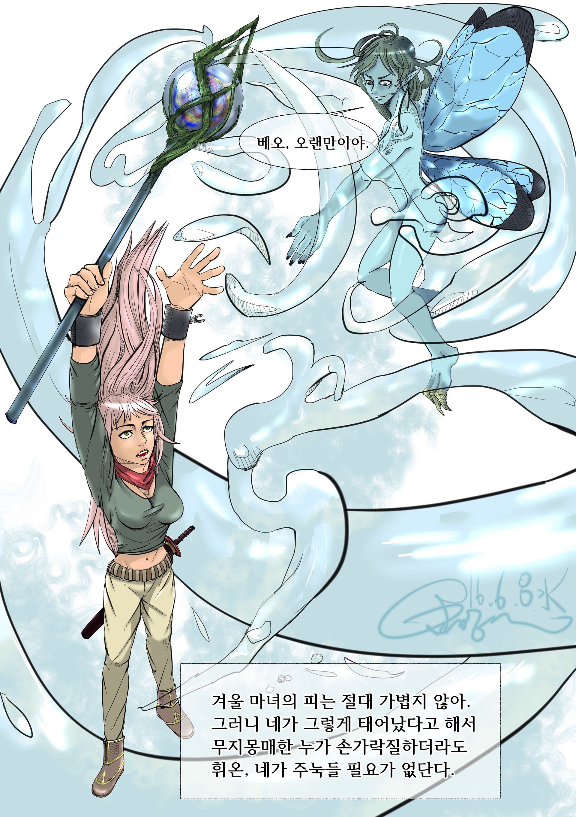 오늘 그림은 저번보다 좀 더 각도를 위로 올려서 주연 캐릭터(머리카락이 분홍색인)의 상체가 좀 더 부각되는 그림을 그려봤습니다.