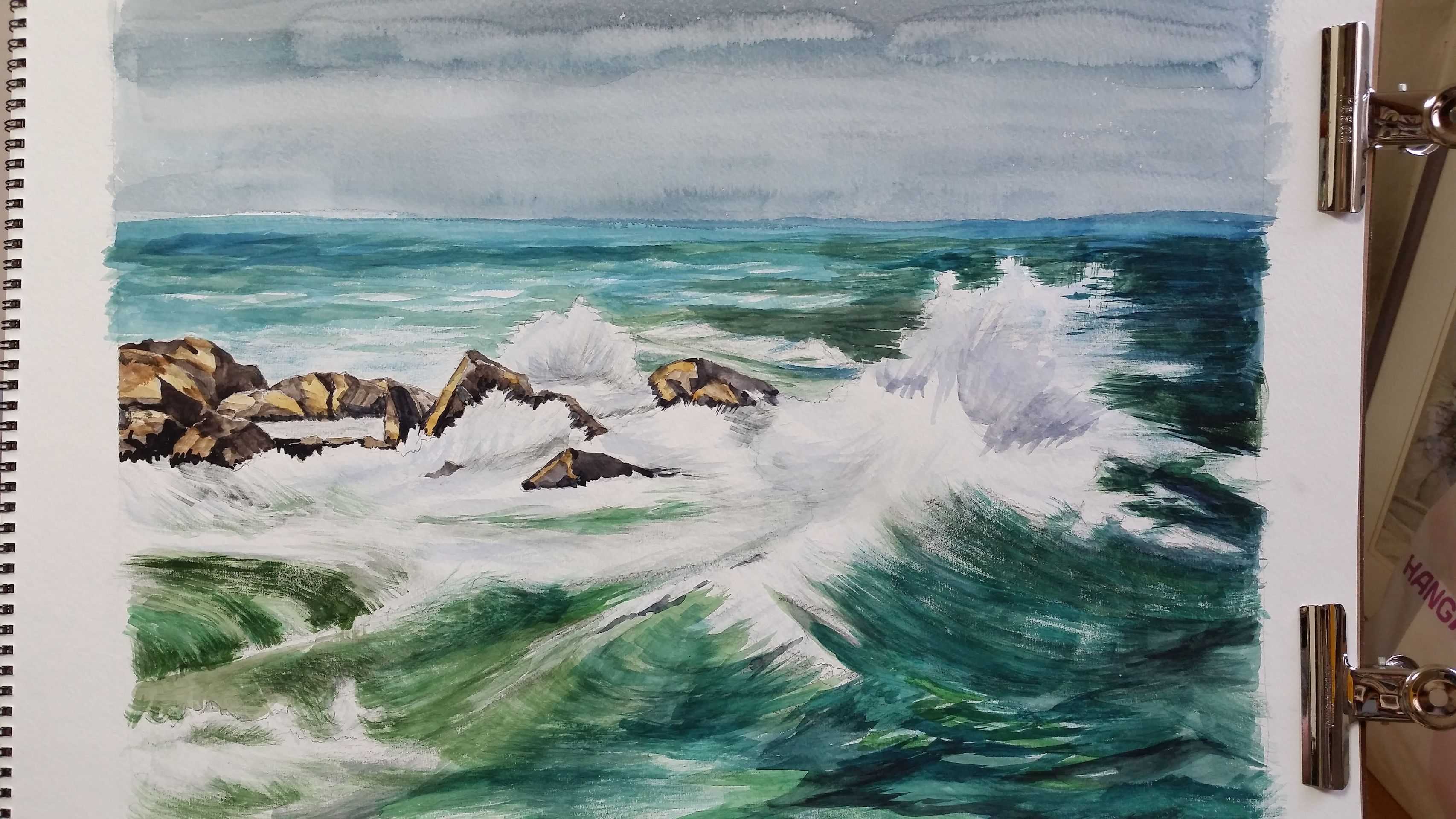 5. 우측 바다물의 검푸른 표현을 하는데에 여러번의 붓질이 가서 좀 지저분한 느낌이 드는데, ( 사용은 12호붓 ) ,좀 더 큰 대형 붓으로 한번에 칠을 하여야 깔끔하게 보일 것인지 ?