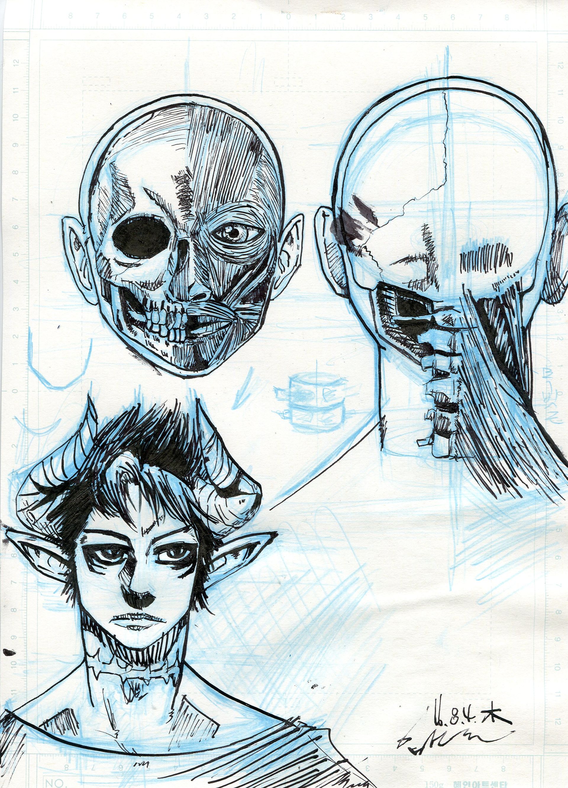 그림의 형태에 보다 신경을 쓰고 공부하려고 합니다. 그런 의미에서 그려본 얼굴의 해골과 근육입니다. 선 연습도 할 겸 해서 선이 두서가 없고 난무하여 지저분합니다. 파란색 색연필이 생각보다 잘 안 지워져서 난감... 하기도 했습니다. 지우다가 포기한 것도 몇 개 있구요...
