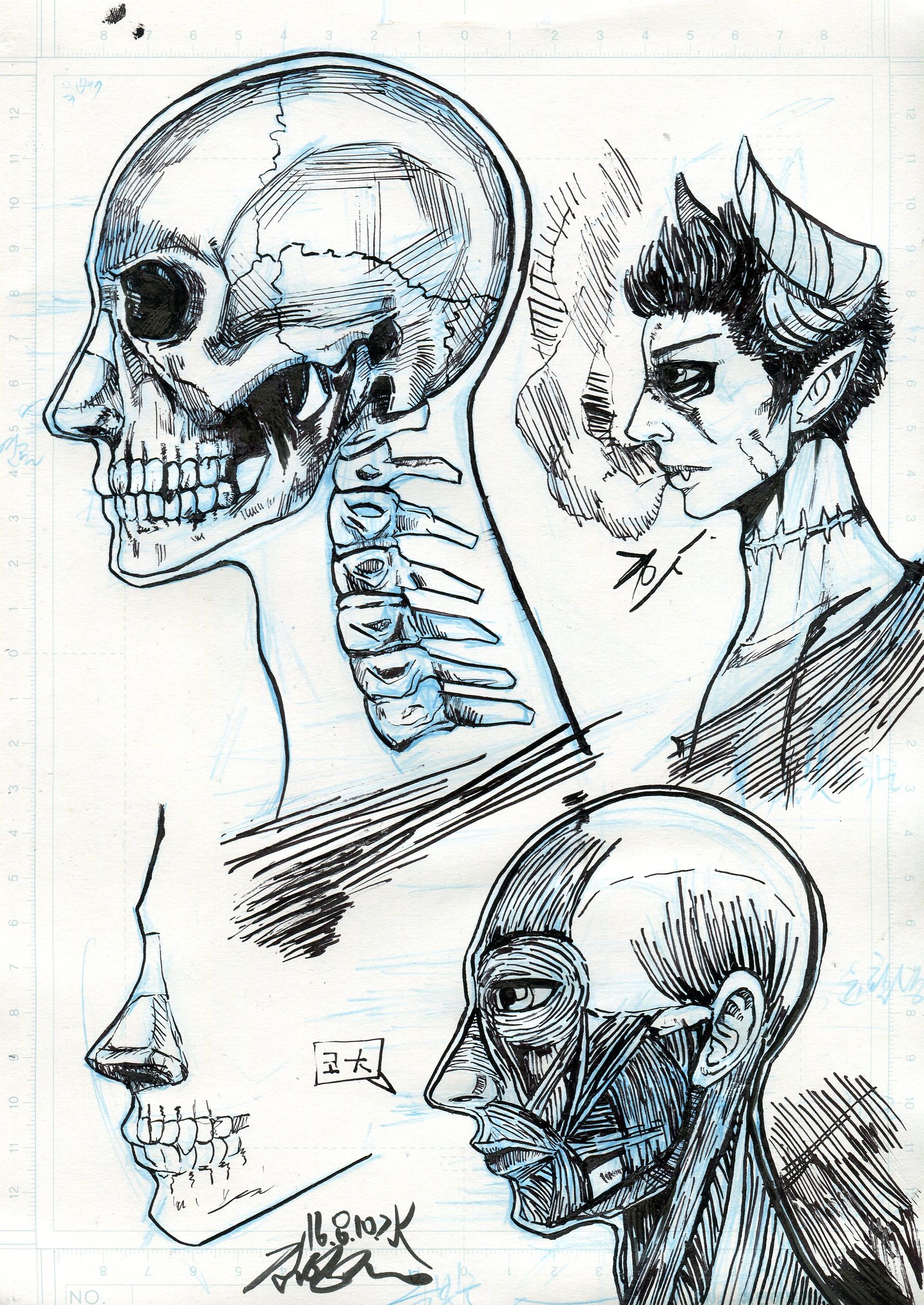 해골의 질감을 표현해 보고자 선을 넣어봤습니다. 다른 것도 마찬가지구요. 문제는 이즘이었을 겁니다.