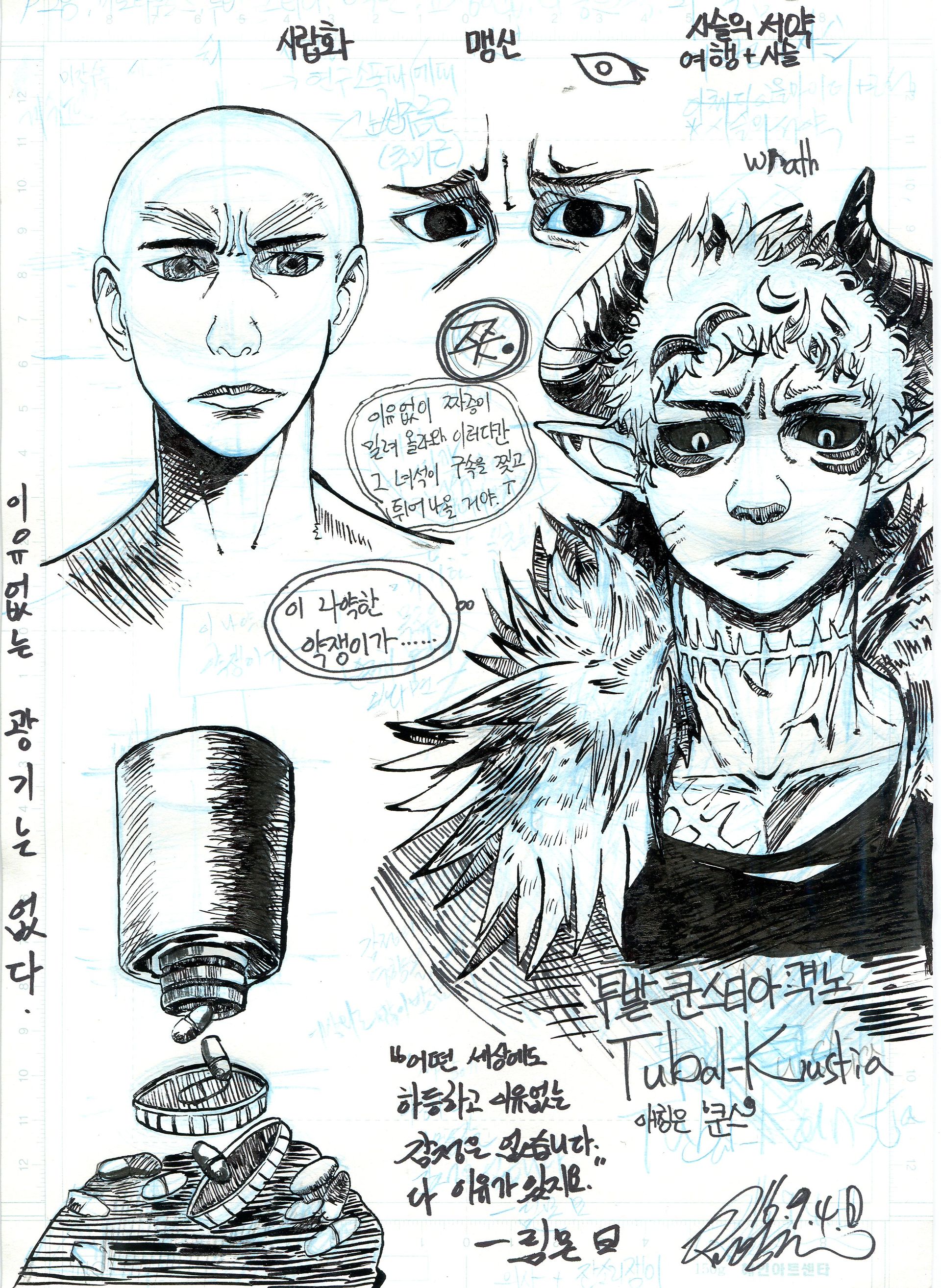 좌우 균형에 신경을 쓰고 러프 스케치와 밑그림을 그리지만, 한창 그릴 때는 몰랐던 불균형들이 펜터치가 다 끝난 후에 드러내는 문제점이 있었습니다. 이를테면, 눈의 위치가 미묘하게 어긋난다던가, 정면인데, 분명 정면을 그렸는데 미묘하게 얼굴이 틀려 있다던가 하는....