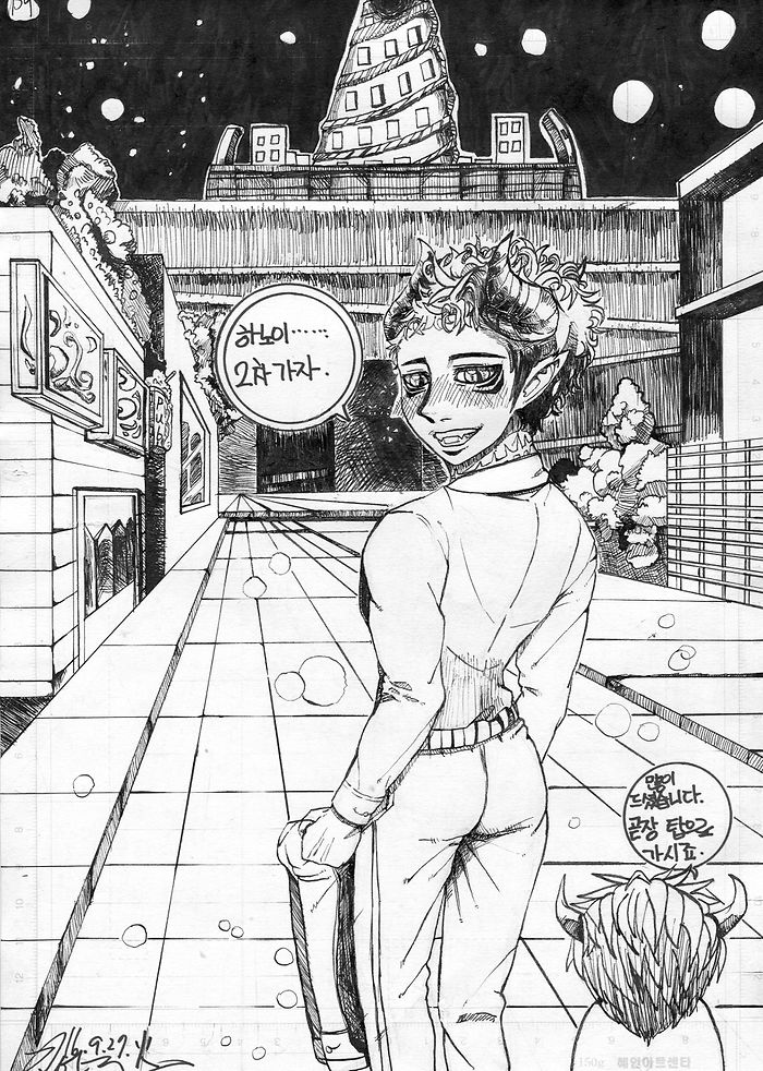 밤 배경이랍시고 하늘을 까맣게 채우고 했지만, 인물과 바닥까지 검게 칠하려니 그림이 너무 칙칙하고 꺼멓게만 보일 것 같아서 하늘과 멀리 있는 사물에만 사선과 먹을 넣었습니다. 이게 괜찮은 것 같습니다.