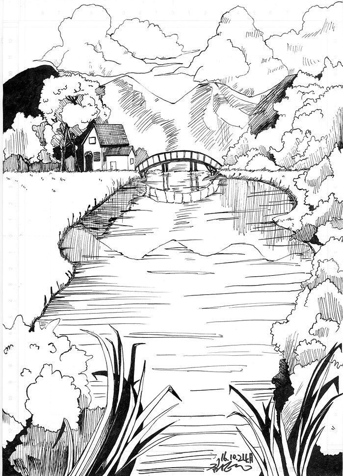 질문 중 하나는 '강에 비치는 그림자 처리'에 대한 것입니다. 미숙하여 실수한 것이 선이 얽혀서 그림자 부분이 약간 지저분하게 처리된 곳이 많습니다. 그만큼 아쉬운 부분이기도 합니다.