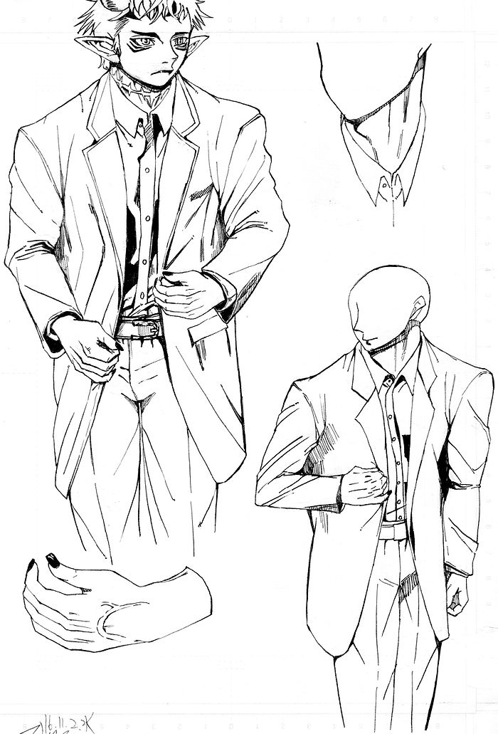 정장 마이의 주름 같은 경우, 겨드랑이와 팔꿈치를 가로 지르는 크고 긴 주름을 하나 그리고 다른 주름들을 잘게 그렸습니다. 다른 부분도 정장 옷깃을 잡고 있는 손가락의 방향을 고려해 주름을 잡았구요.