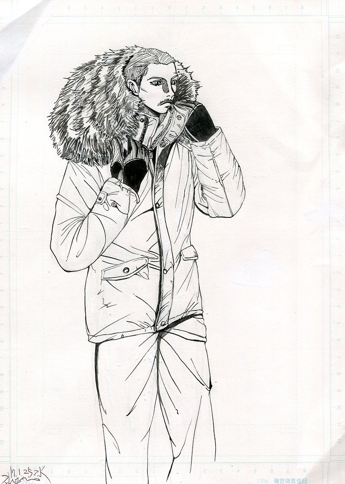 원본이 된 광고면 역시 비싼 등산복 브랜드의 파카였습니다. 저는 처음 보는 것이었구요. 그래서 처음에는 구성을 알지 못해 무작정 따라 그리기도 했었습니다. 그러다가 파카의 재질, 주름의 위치, 털의 형태, 캐릭터의 표정 등.. 차차 모를 때는 보면서 그리는 것도 괜찮다고 생각했습니다. 자료는 그래서 많으면 많을수록 좋다고 말입니다.
