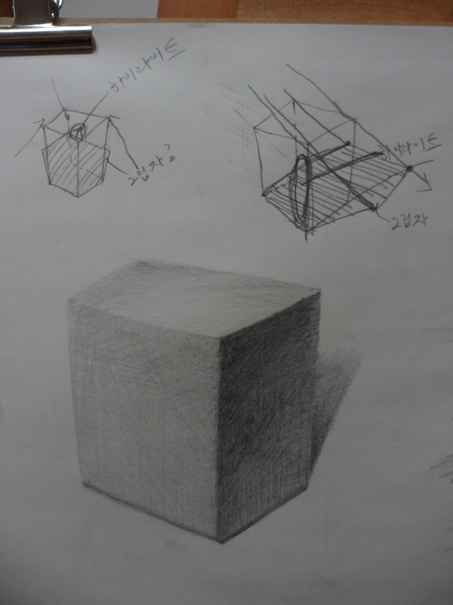 안녕하세요. 수업 잘 듣고 있습니다. 저는 전에 화실에 딱 4번 나갔다가 선생님이 불친절해서 그만두고 동영상강의를 듣는중입니다. 그때 그렸던 사각형보다 지금강의가 사각형을 실감나게 그리는데 도움이 되서 다행이고 감사합니다.그런데 질문이 있어요. 그림자말인데요, 빛이 정면에서 오면 그림자가 오른쪽이 아니라 바로 뒤쪽, 그러니까 정면에서 봤을때 그림자가 안보여야 하는거 아닐까요? 하이라이트가 정면위쪽에 생기니까요. 그림자가 오른쪽에 생기려면 빛이 왼쪽에서 와야할텐데 제가 선생님 설명을 잘 이해못한건지 헷갈려서요. 제가 그림을 그리고 그 위에 조그맣게 설명을 그려놨는데 한번 보시고 자세한 답변 부탁드려요 . 정말 몰라서 묻는거니까 혹 기분나빠하시진 않았으면 좋겠어요.^^ 그리고 제가 그린 사각형 평가 부탁드려요. 동영상 강좌듣고 처음 그려본겁니다.
