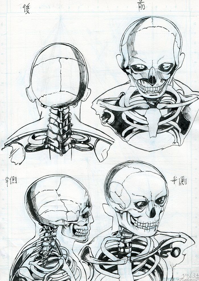 정면에서 보는 각도의 얼굴만 그리다가 요새 캐릭터의 얼굴에도 각도를 주고 있습니다. 거기서 발생하는 문제점도 몇 개 있고 해서 오늘은 '해골이 각도를 틀어서 생긴 얼굴의 변화'에 대해 질문하고자 합니다.