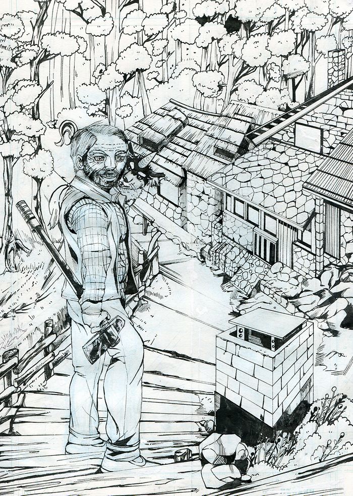 그림의 주제인 노인과 근경을 위해서 원경인 나무들의 묘사는 되도록 생략했습니다. 너무 대충한 게 아닌가 싶을 정도로요. 중경인 집과 나무 계단은 먹을 칠했구요. 노인 주름 튜터링에서 배웠던 대로 근육의 결을 따라 주름을 표현하고자 했으나 주름이 곳곳에 너무 진해져 버렸네요. 뭐든 적당히가 좋겠지요.