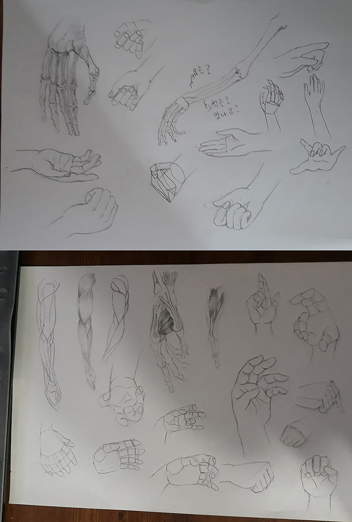안녕하세요. 선생님 ^^오늘은 손 드로잉을 들었습니다. 사실 인체드로잉을 배우려고 맘먹은 계기가 손과 팔 동작을 자유자재로 그리고 싶어서이기도 합니다. 전체적인 인체그림도 마찬가지구요.뼈대부터 배우니 그리기가 더 수월해진거같습니다. : )그리고 오늘 중요한 실습으로 손을 덩어리로 생각하여 그리니 훨씬 쉽네요. 좋은강의 감사합니다.그럼 추운날씨에 감기 조심하세요~* 맨위에 작은 손그림들은 강의를 보고 그린게 아니라 어설프네요. ㅎㅎ