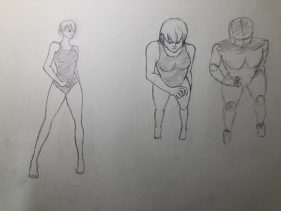 팔을 꺾은 동작을 위에서 내려다보는 시점으로 표현하기