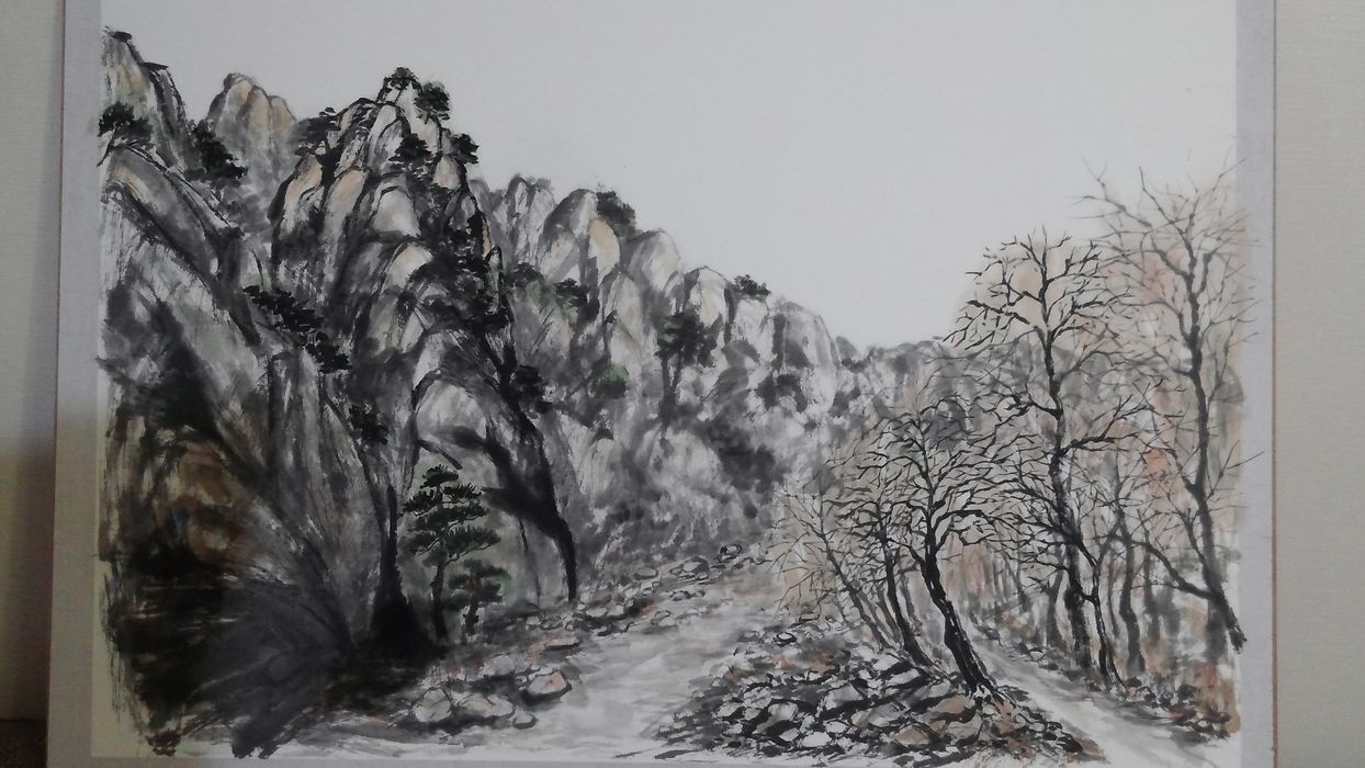 산수화는 처음 그려보지만 바위산과 계곡과 나무들.....,