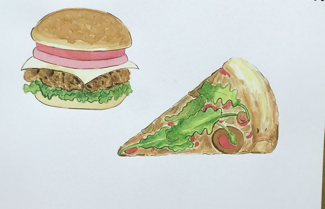 햄버거 치킨 상추 부분은 원했던 색감이나오질 않고 디테일한 부분도 쉽지 않네요생각처럼 되지 않아 당황스럽고연습을 더 해야할것 같아요~피자도 어색한 부분 투성이로 마무리했어요 ㅠ물감 농도조절이 ... 보는거와 칠하는거와 많이다른듯해요 전... 그래서 선생님그림보고색감 찾다 덧칠하다 보니 더 탁해지는듯 합니다~