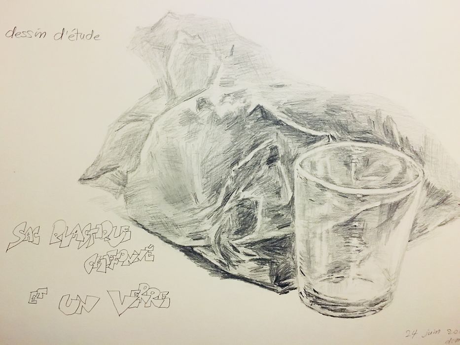 자평: 유리컵이 주인공이라면 검은비닐봉투는 조연인데, 저의 경우, 비닐봉투가 주연인 양, 선 긋기가 다소 요란해진 듯합니다. 아무래도 유리컵의 “까칠하고 냉정한” 질감을 크게 살리지 못한 게 이유인 듯 하고, 특히 컵 밑둥의 빛의 굴절에 의한 특유의 무늬가 원한 만큼 살려지지 않아, 보는 이로 하여금 시선이 컵보다는 봉투에 뺐겨서 그럴 듯 싶습니다. .. 총총2