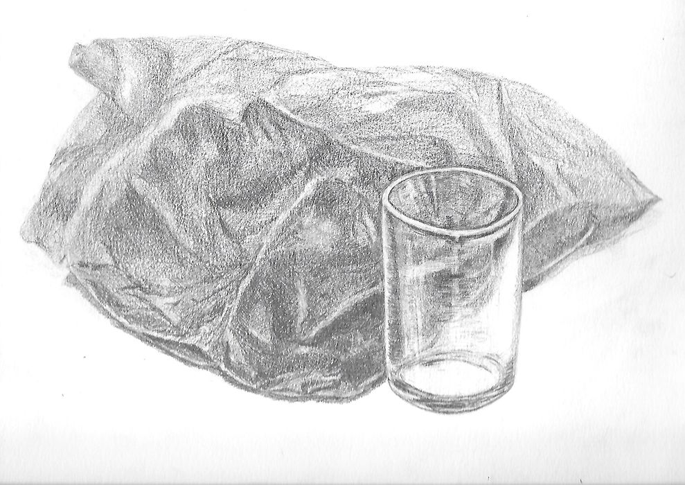 으와, 드디어 구겨진 검은 비닐봉지와 유리컵을 그렸어요.