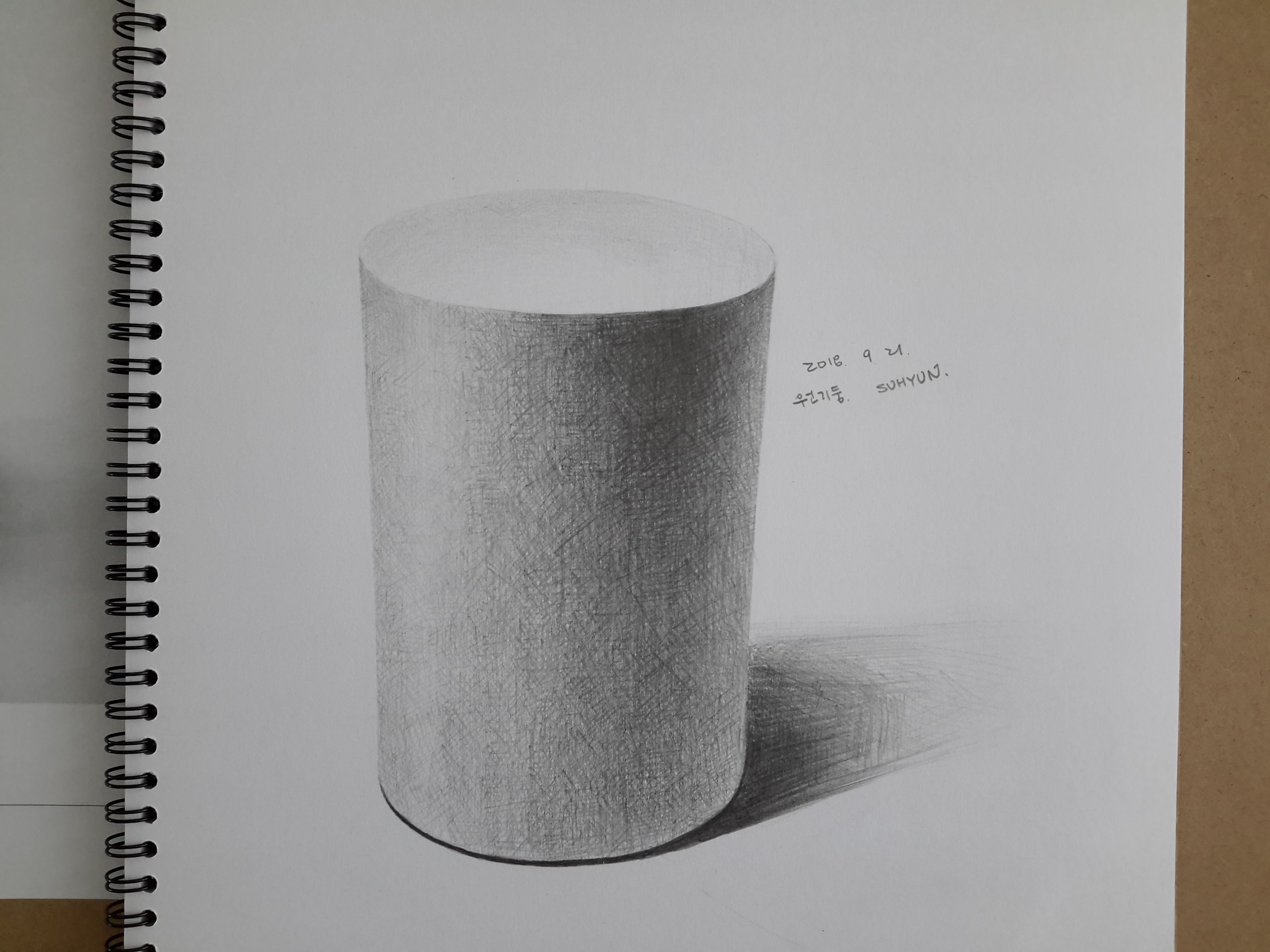 선생님께서 말씀주신 부분윗부분 경계선 흐리게와그림자 안쪽부분 진하게수정하여서 다시 도전하였습니다,그런데 이번엔짜리몽땅 통통한 통나무처럼 보이네요.흑.....밑면을 일부러 살짝 줄여서 그려본다는 것이너무 줄였나봐요.ㅜ.ㅠㅋㅋㅋ초조한 맘으로 선생님 말씀 기다리겠습니다~~~~~즐거운 추석연휴 보내시어요~~~~~^^