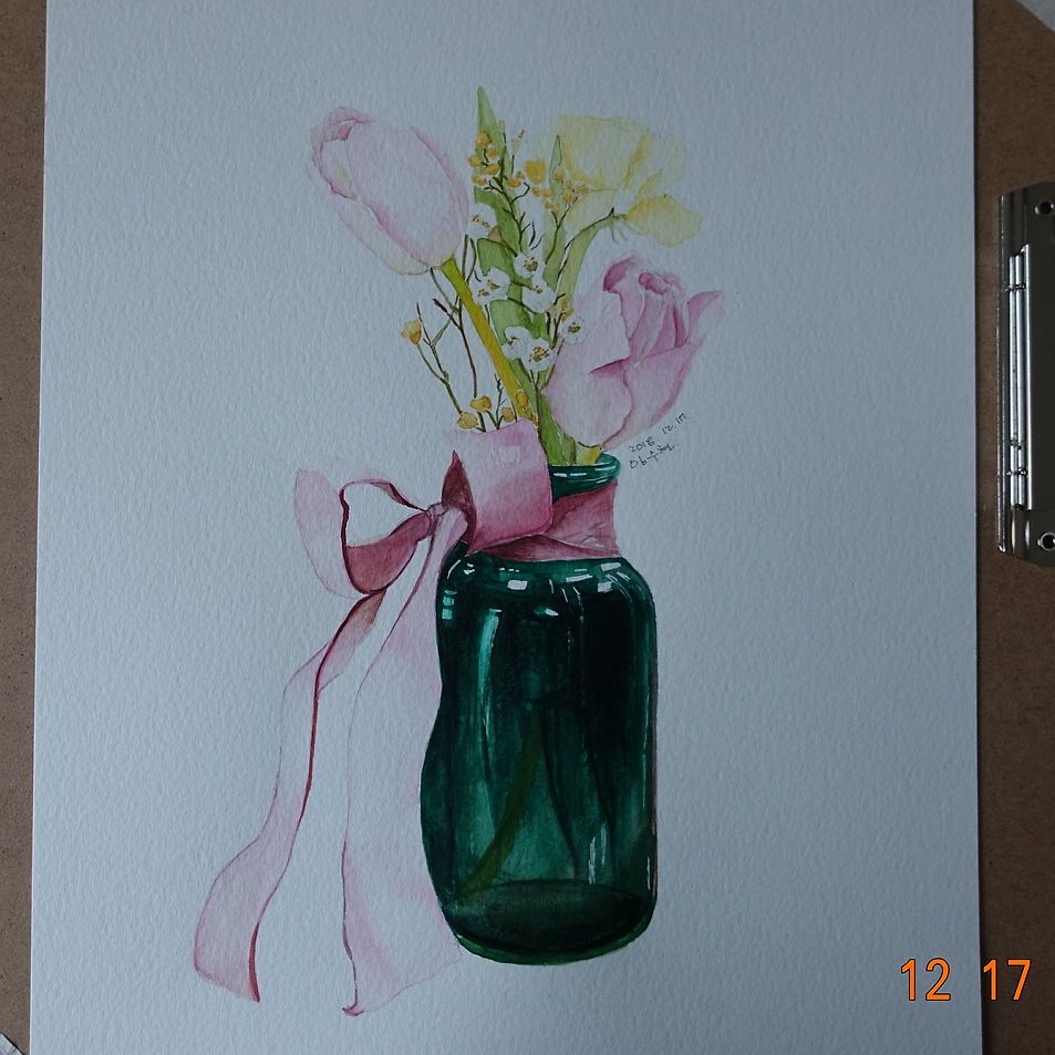 수채화, 정말 설레면서도 정말 어렵습니다.흑.리본도 너무 밝고유리병의 빛 비치는 하얀 부분도 너무 덮어버린 듯 하지만더 손대면돌아오지(?) 못할까봐이쯤에서 멈추고다시 그려보려구요.ㅡㅜ병 표현이 아주 어렵네요.어려운 것이 당연하겠지만요.ㅋㅋ평가 기다릴께요~♡