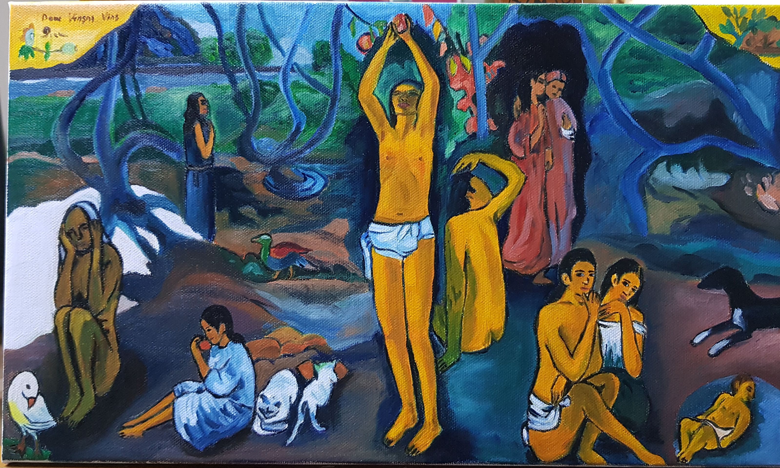 안녕하세요~고갱의 작품 '우리는 어디서 왔는가? 우리는 누구인가? 우리는 어디로 갈 것인가?' 모사 결과 올립니다.개인적으로 르누아르 그림 모사보단 그리기 좀 편했던것 같습니다~ 수업중 선생님께서 궁금해하셔서~^^평가부탁드립니다~