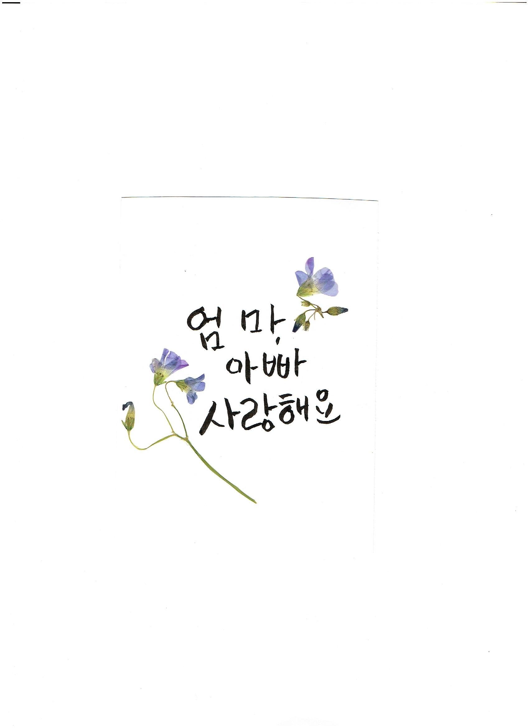 악필도 괜찮아 란 말에 희망가지고 선생님의 강의 들으며 열심히 따라 배우고 있습니다.그러던 중 글씨를 쓰고 압화를 붙이니 왠지 뿌듯함을 느껴 용기를 내어 올려 봅니다.압화는 제가 직접 꽃을 따서 책 갈피에 넣어 만든 것을 사용하였습니다.