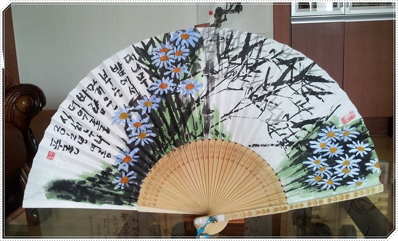 요즘 휴가 중인가요? 튜터링이 안되고 있네요. 시간되면 한번 봐 주시기 바랍니다. 부채에 그리는 수묵화는 화선지와 많이 다르군요. 먹물이 잘 먹지 않고 접힌 부분에서 붓이 잘 나가지 않네요. 들국화는 줄기와 잎을 세부적으로 표현하지 않았는데.. 이런 그림은 어떤지 평가 부탁드립니다.