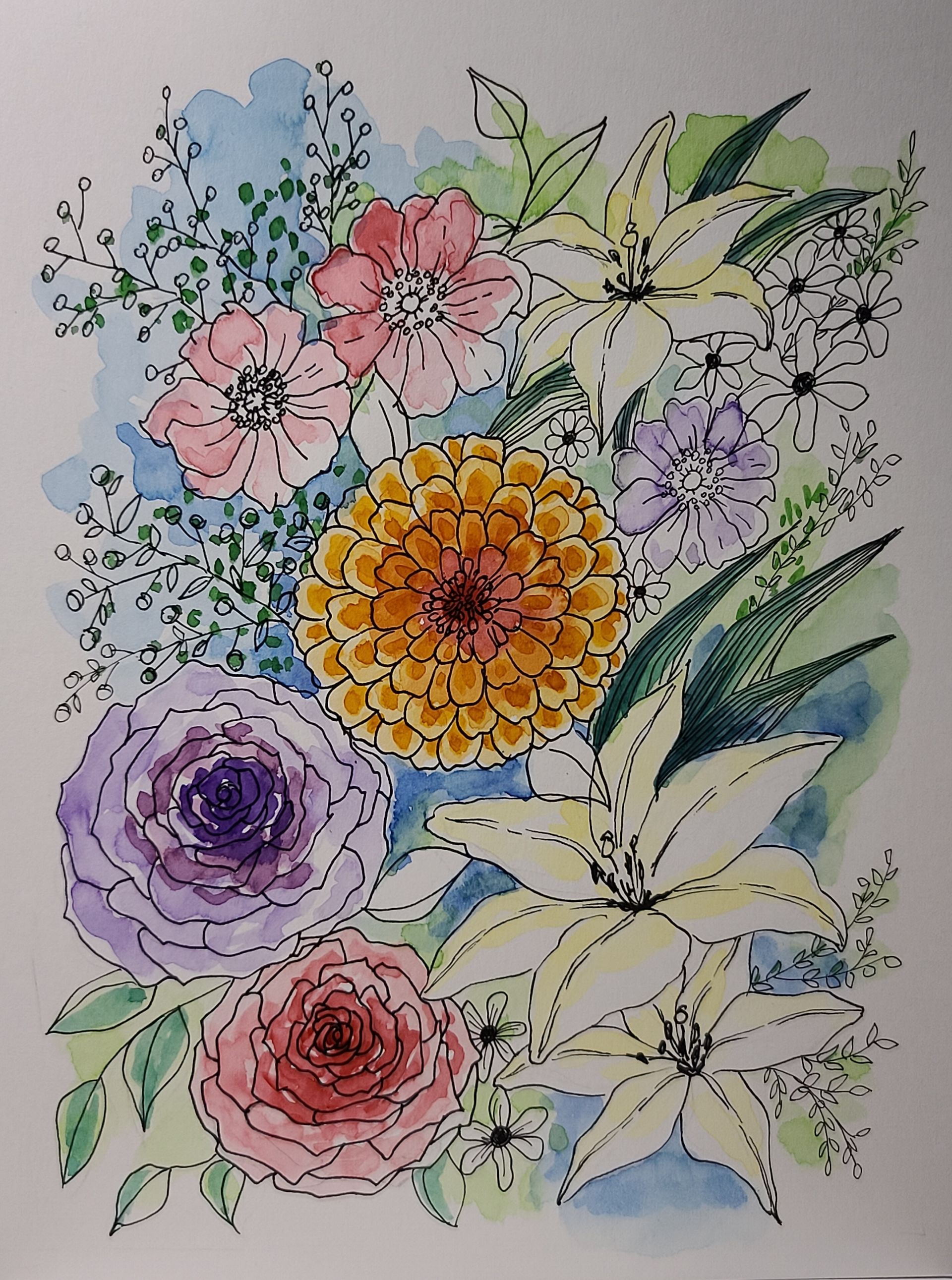 활짝 핀 꽃을 그리면서 기분이 좋아졌습니다. 역시 수채화 채색은 어렵습니다.