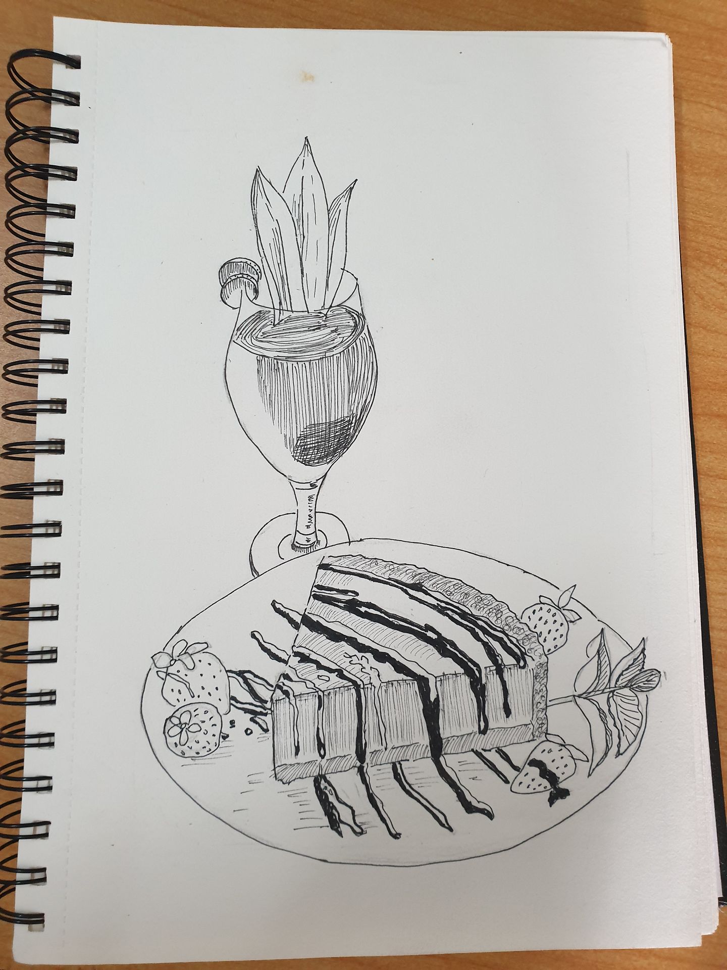 딸기쥬스와 케이크 그렸어요. 계속 따라하다 보면 선생님처럼 사진만 보고도 이렇게 그릴 수 있겠죠?