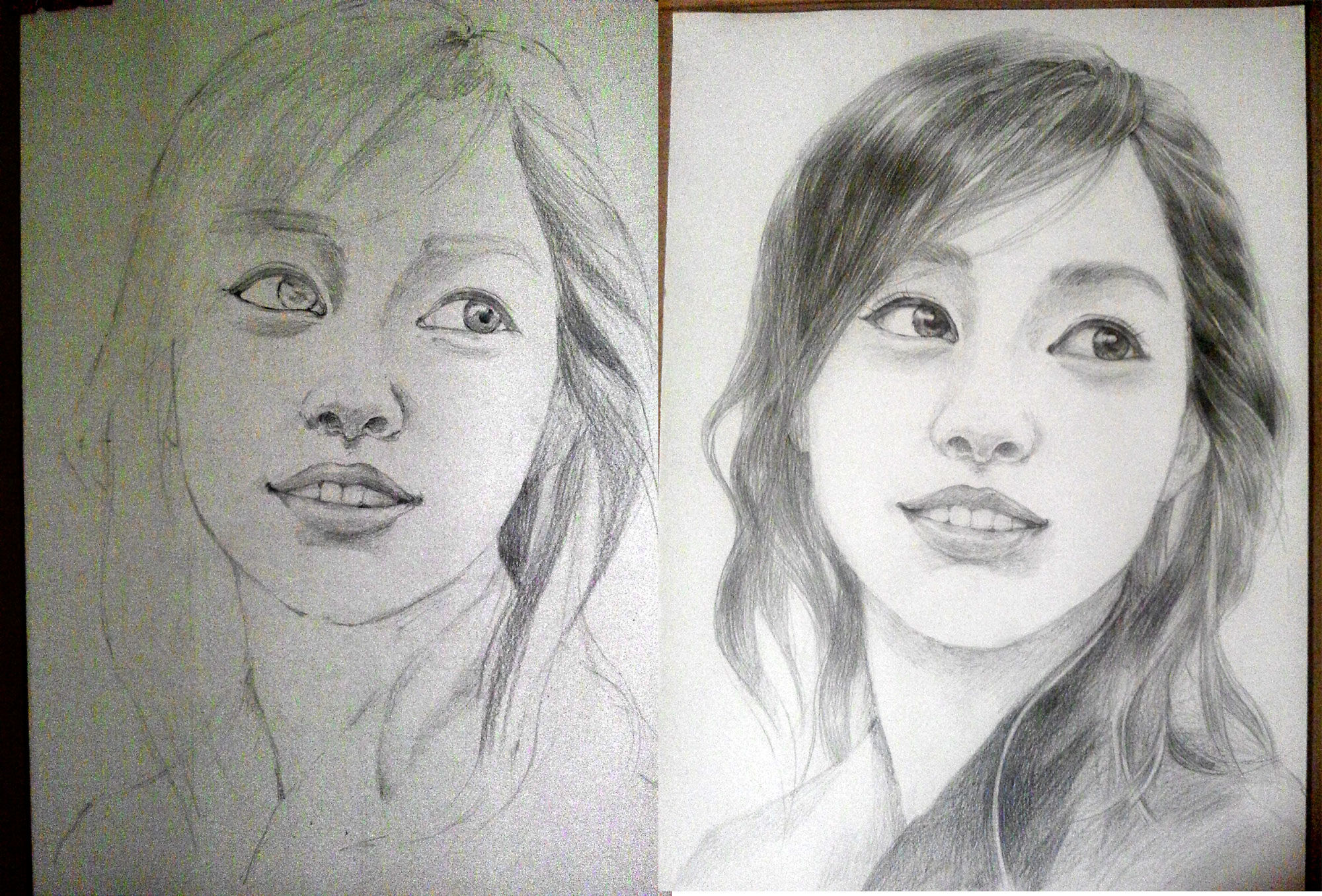 진행 과정 중에 사진을 찍었습니다. 처음 사진을 안 봤으면 모르겠는데 비교를 해 보니 뒤로 갈수록 김태희의 이미지가 사라지는 것 같아요. 그냥 예쁜여자라는 느낌... 처음 형태를 잡은 사진은 다른 사람들이 봐도 바로 김태희다! 하고 알아채던데 현재 상태는 진세연이나 박은혜를 닮은 것 처럼 보이네요. 눈이 둔해져서 그런가, 자꾸 보니까 더 모르겠어요 선생님 ㅠㅠ 더 손대기 전에 어디를 주의해서 그려야 왜곡을 막을 수 있을까요?
