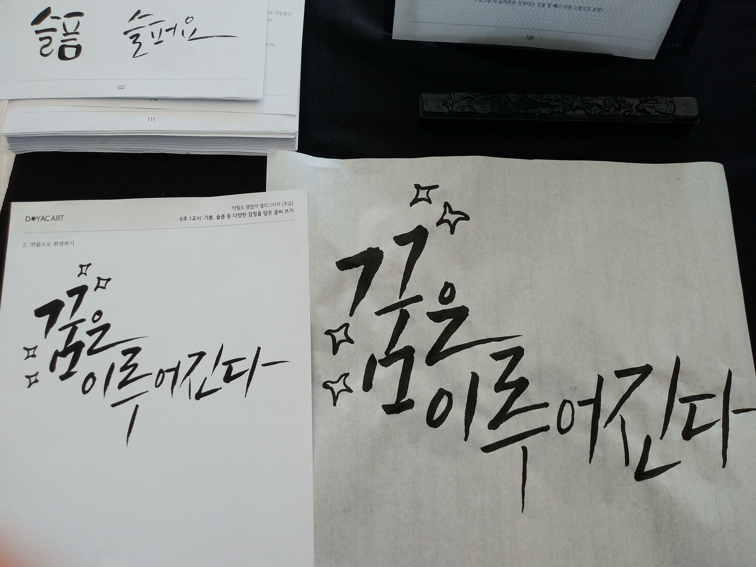 닉네임을 햇살나무에서 차분나래로 바꿨어요~^^붓은 붓펜의 한계를 넘어 더 자유로운 표현을 가능하게 하네요^^임서의 과정은 길고... 오늘도 열심히 샘 글씨 따라쓰고 붓을 놓으니 손이 금방 샘 글씨를 잊어버리네요. 안보고 쓰면 금새 어떻게 써야할지 막막해요ㅠㅠ교안이 있어서 도움이 많이 돼요~^^*