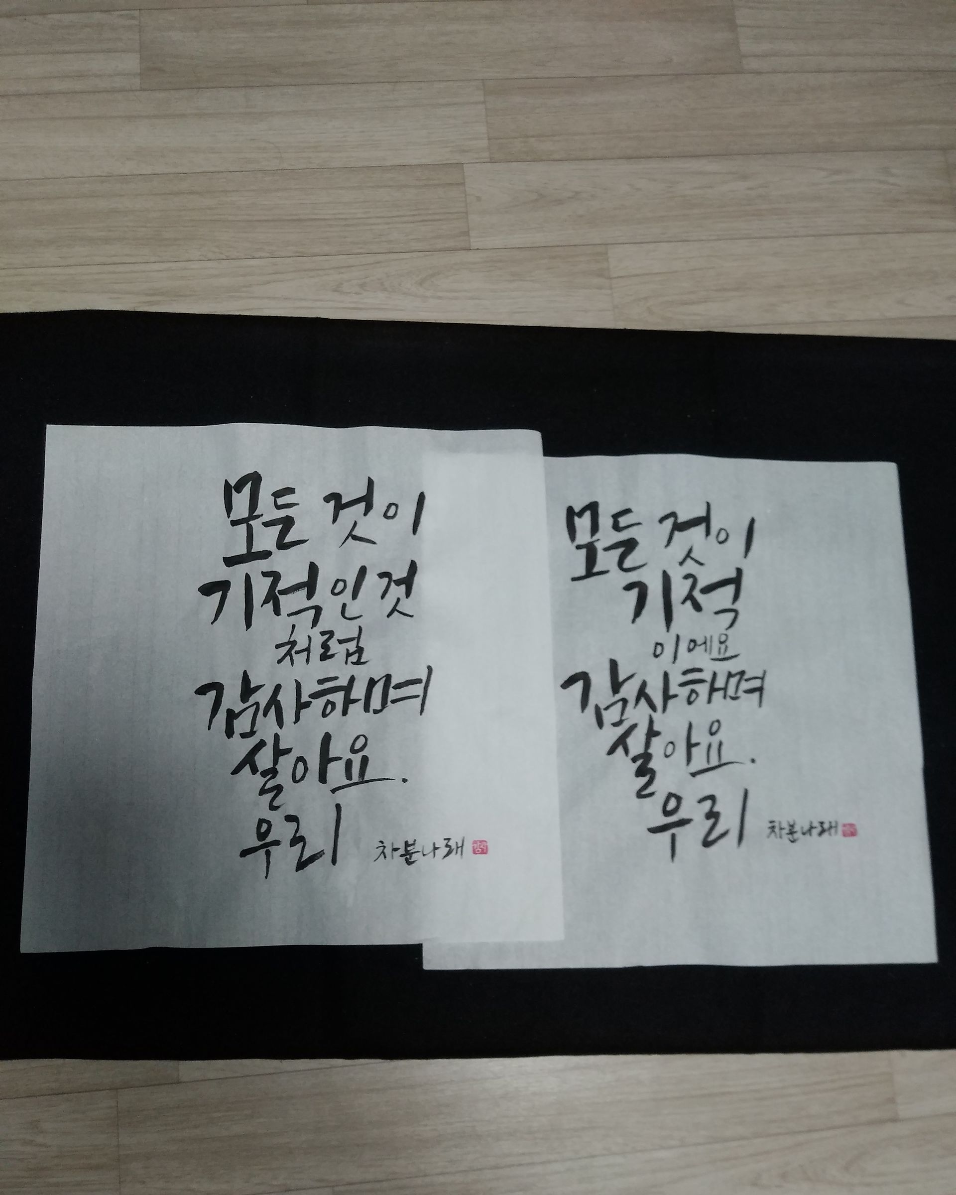 며칠 바빠서 강의를 못들었어요~ 오랜만에 캘리하니 참 좋네요^^ 화선지의 스며듬, 붓의 자유로움, 먹의 깨끗함, 그리고 여백의 아름다움까지.. 이번 강의에서는 먹그림 팁도 알려주셔서 좋았어요.. 서툴지만 연습 많이 해서 담에 올릴게요~ 좋은 한 주 보내세요^^