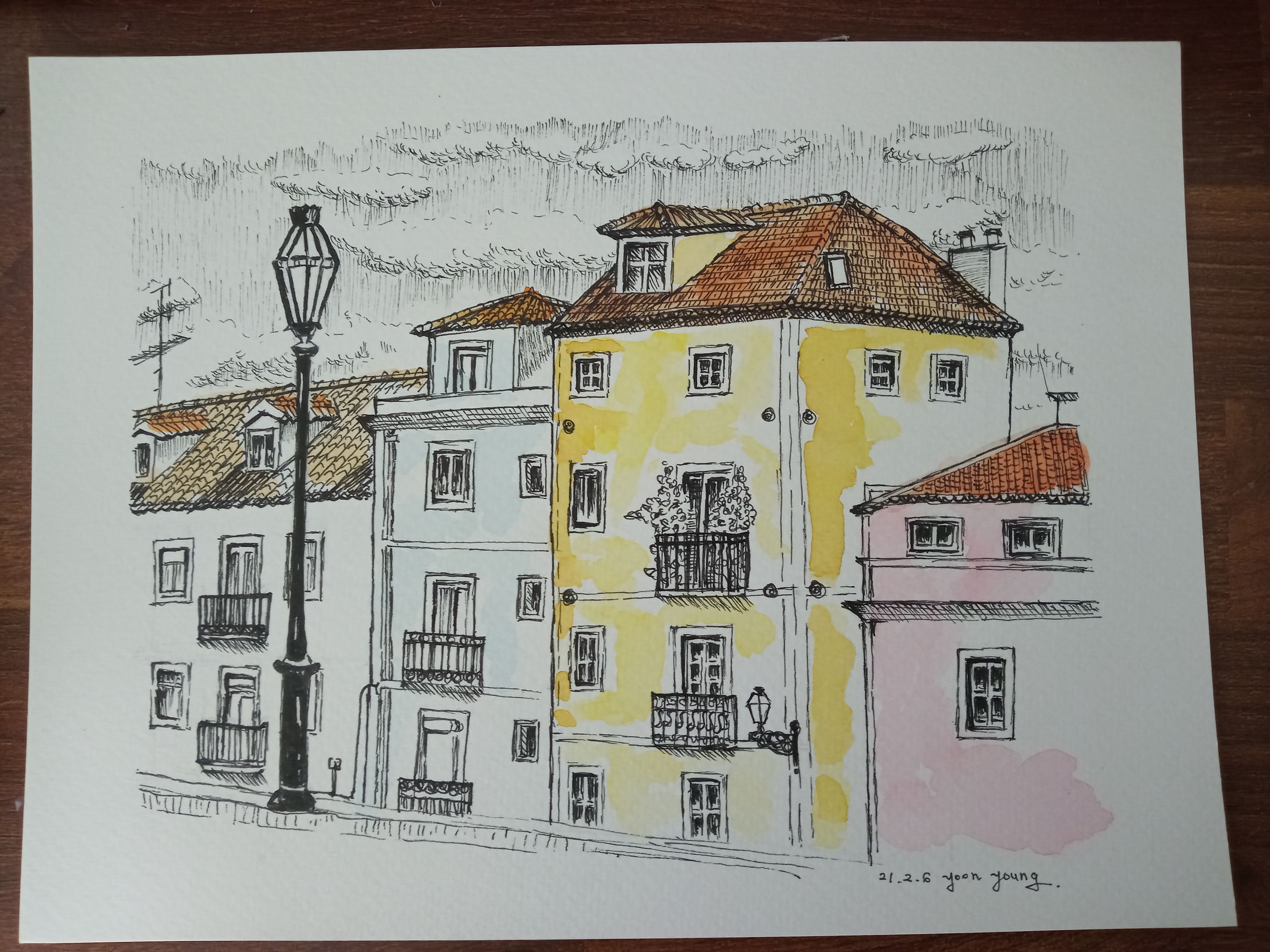 건물의 수직선이 한쪽으로 기울지 않게 그리기가 어렵네요^^ 물감으로 색칠할때. 좀 진하게 되면 탁하면서 웬지 덜 멋스러운것같애요.. 농도를 맞출때물을 많이 섞어야 하는것같애요..