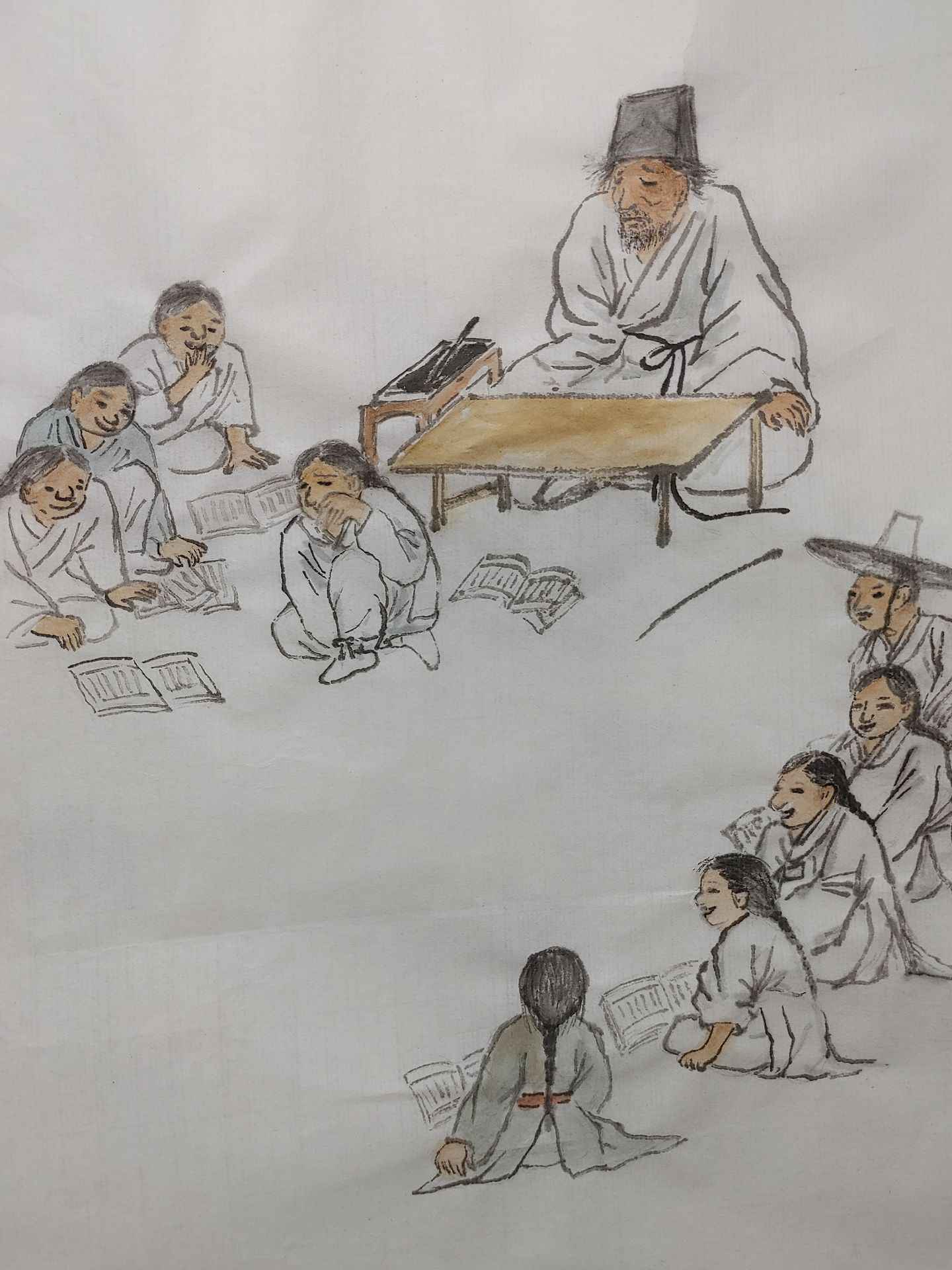 단원의 서당 풍경 속 아이들의 생동감 넘치는 에너지와 키득거리는 웃음 소리, 우는 아이의 서러운 마음과 매는 들었지만 안스러워하는 훈장님 마음까지 담고 싶은 건 저만의 욕심이겠죠? 표현은 뜻대로 안 되었지만 단원의 명화 속에 잠시 머물렀던 것만으로도 즐거웠답니다. ^^