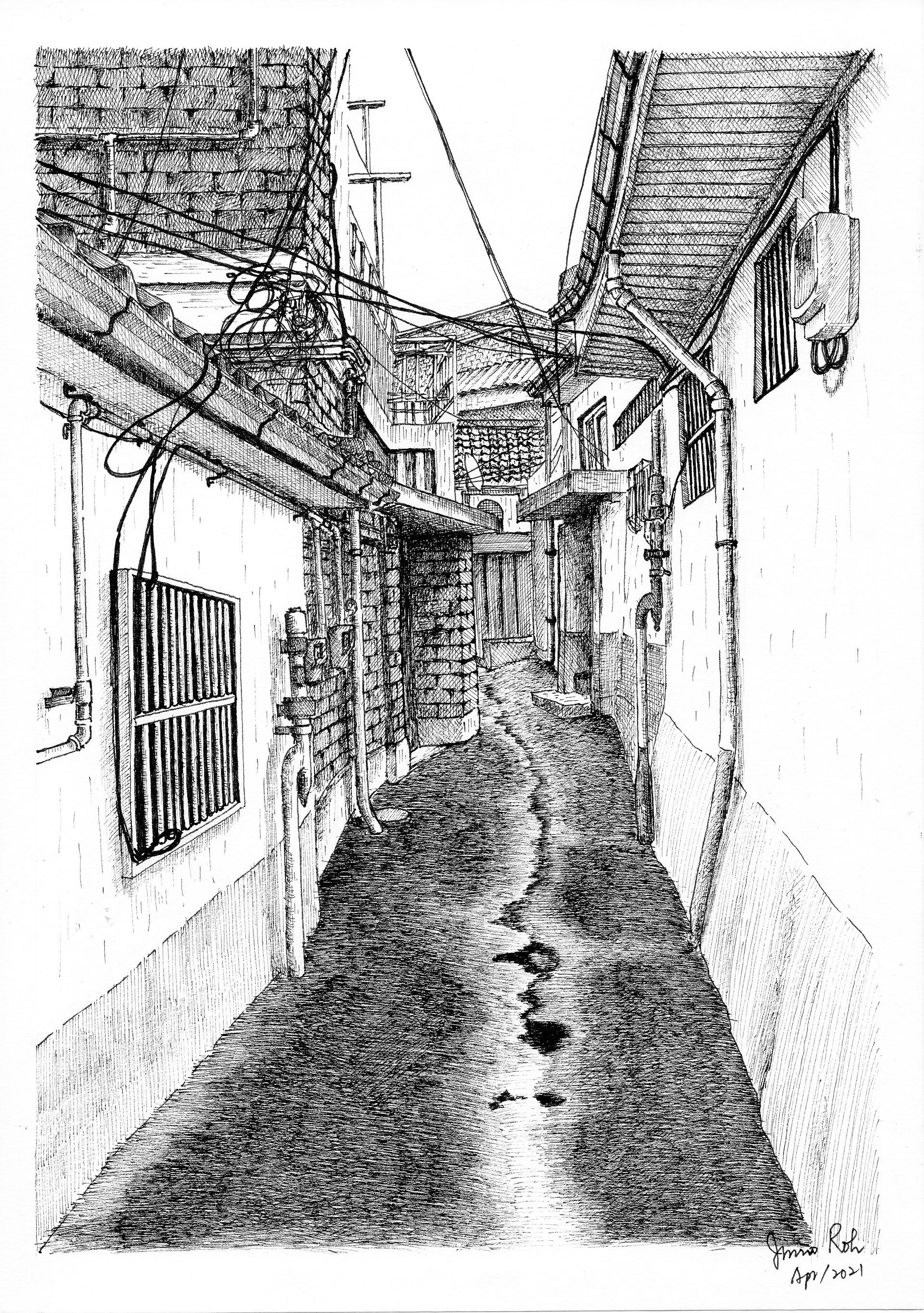 물에 젖은 골목길 바닥면을 좀 더 사실감 있게 표현하려고 해 봤는데 잘 됐나 모르겠습니다.